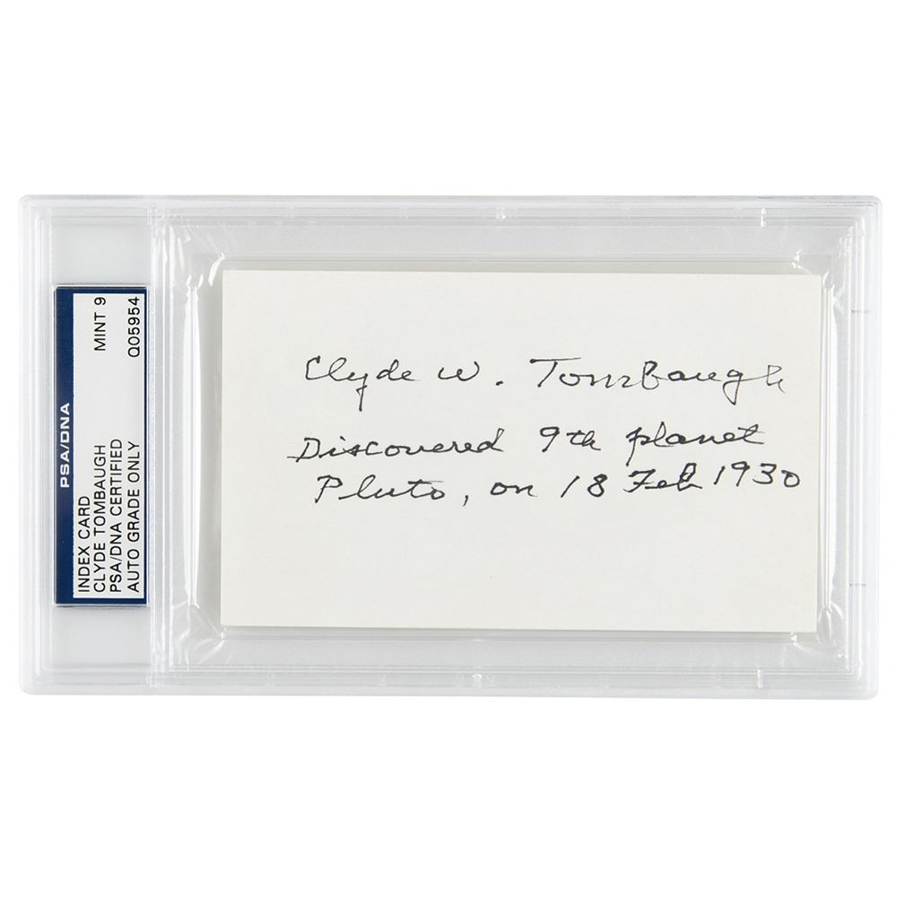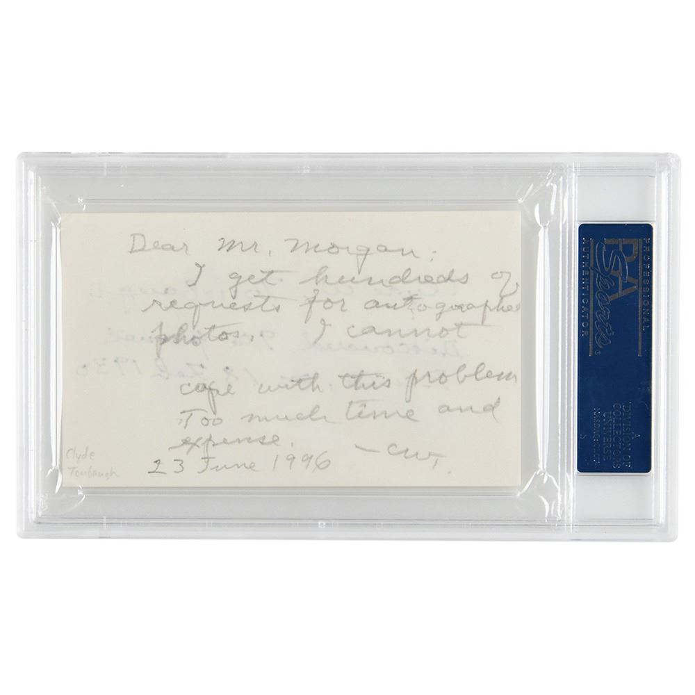 Ink signature, "Clyde W. Tombaugh, Discovered 9th planet, Pluto, on 18 Feb. 1930,†on an off-white 5 x 3 card, the reverse of which bears an ALS in pencil by Tombaugh signed with his initials, “CWT.†Dated June 23, 1996, the brief handwritten letter reads: "I get hundreds of requests for autographed photos. I cannot cope with this problem too much time and expense." In very fine condition. Encapsulated and graded by PSA/DNA as "MINT 9."