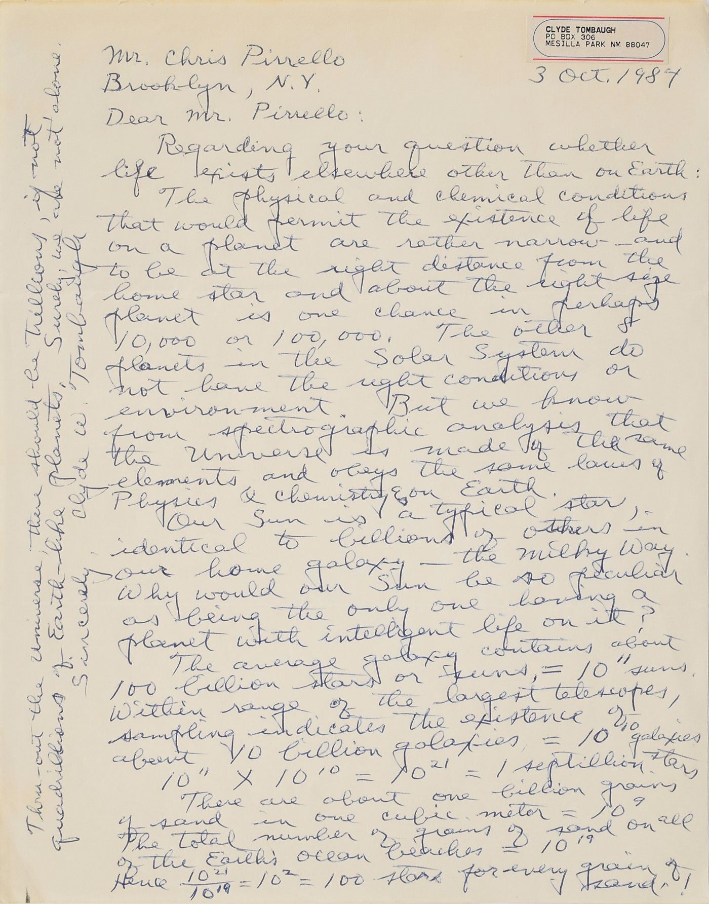 American astronomer (1906–1997) best known for discovering Pluto in 1930. ALS signed “Clyde W. Tombaugh,” 8.5 x 11, October 3, 1984. Letter to Chris Pirrello, in part: "Regarding your question whether life exists elsewhere other than on Earth: The physical and chemical conditions that would permit the existence of life on a planet are rather narrow—and to be at the right distance from the home star and about the right size planet is one chance in perhaps 10,000 or 100,000. The other 8 planets in the Solar System do not have the right conditions or environment. But we know from spectrographic analysis that the Universe is made of the same elements and obeys the same laws of Physics & chemistry on Earth. Our Sun is a typical star, identical to billions of others in our home galaxy—the Milky Way. Why would our Sun be so peculiar as being the only one having a planet with intelligent life on it?…Thru-out the Universe, there should be trillions, if not, quadrillions of Earth-like planets. Surely, we are not alone." Upper right corner bears Tombaugh's return address label. In fine condition.