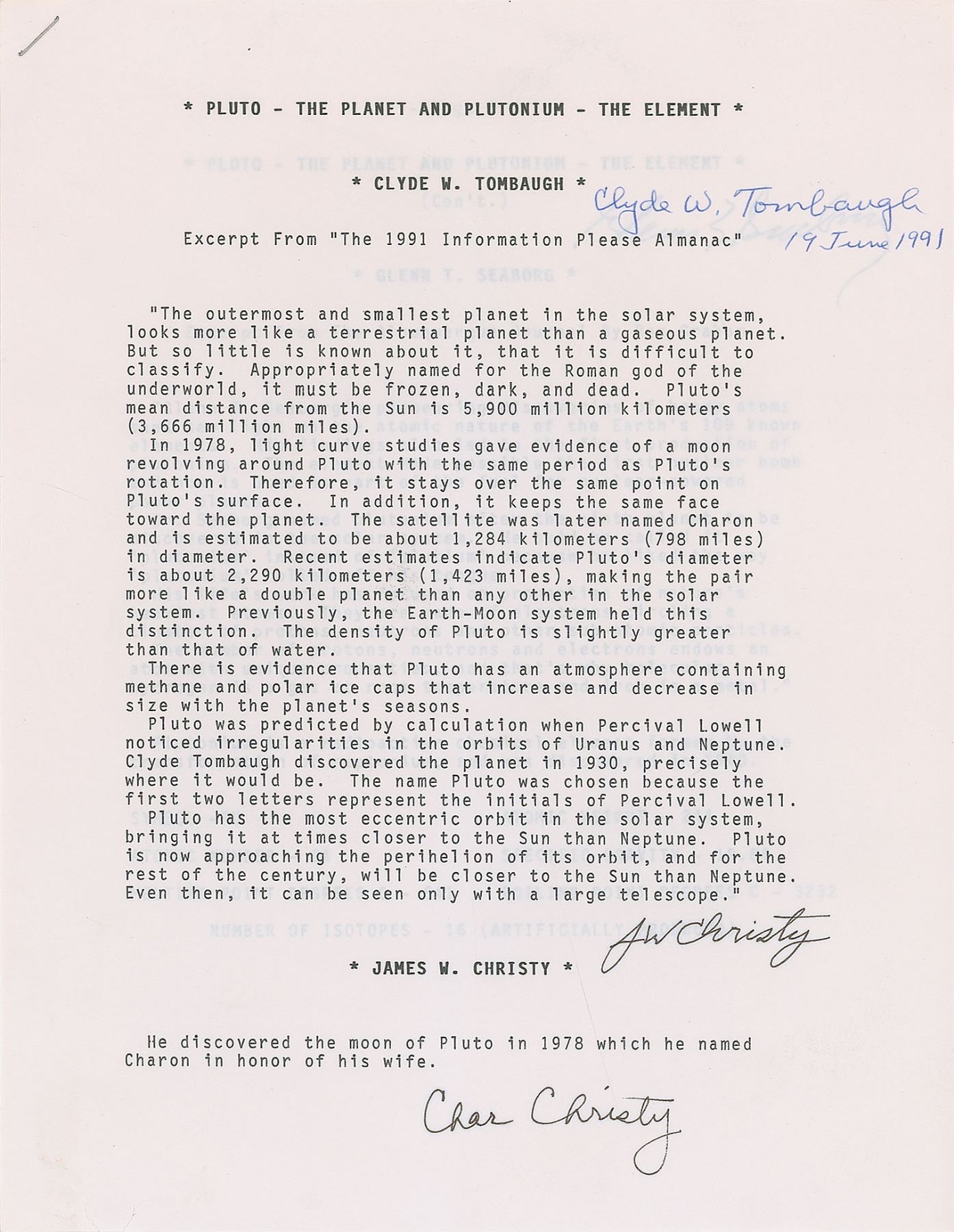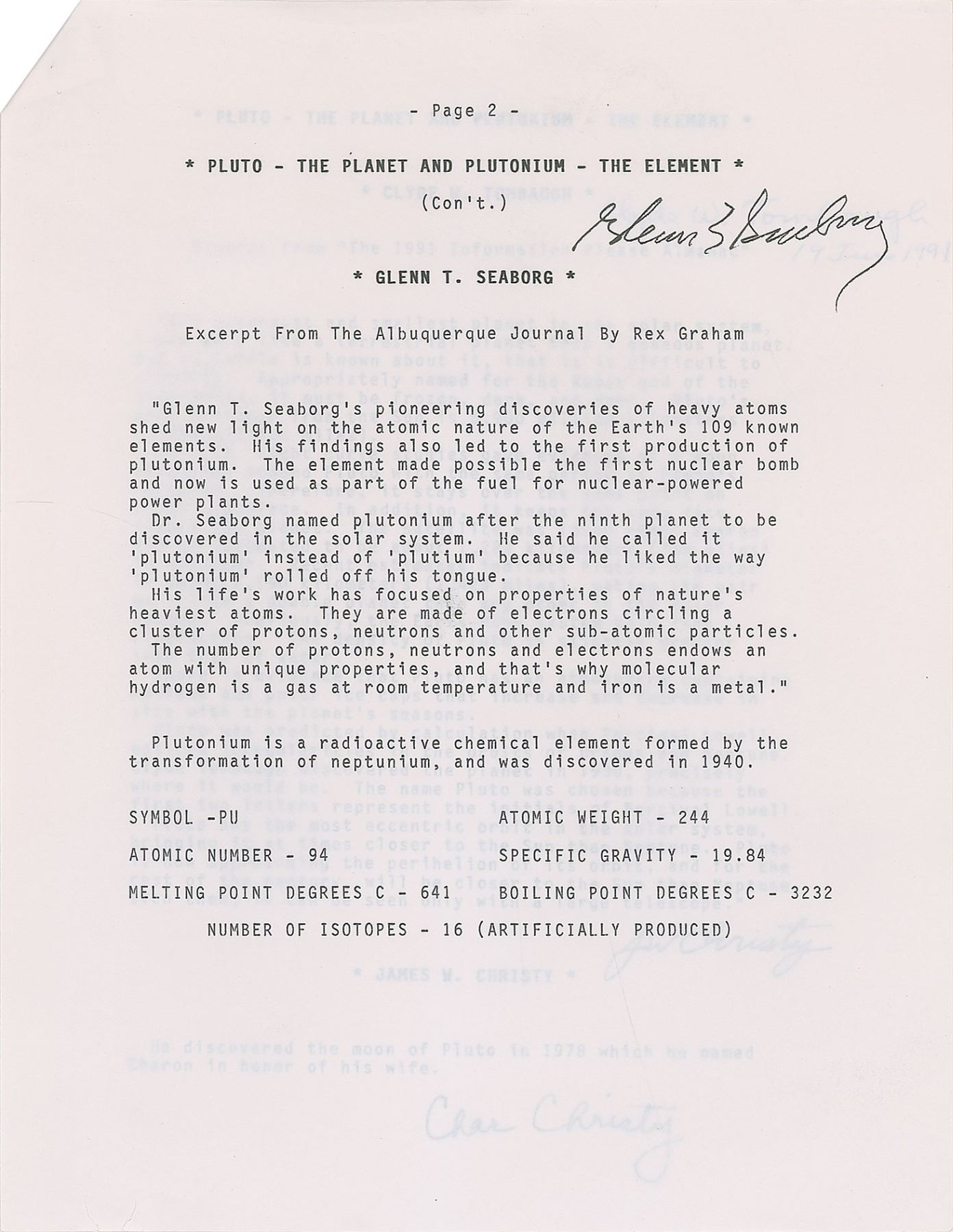 Typescript containing biographies and excerpts from works by Clyde W. Tombaugh, James W. Christy, and Glenn T. Seaborg, two pages, 8.5 x 11, with the first two mentioned signing on the first page in blue ballpoint, "Clyde W. Tombaugh, 19 June 1991," and in black ink, "J. W. Christy," and the latter signing the second page in black ink, "Glenn T. Seaborg.' The first sheet is also signed by Christy's wife Charlene "Char" Christy, the namesake of the Pluto moon. In fine condition.