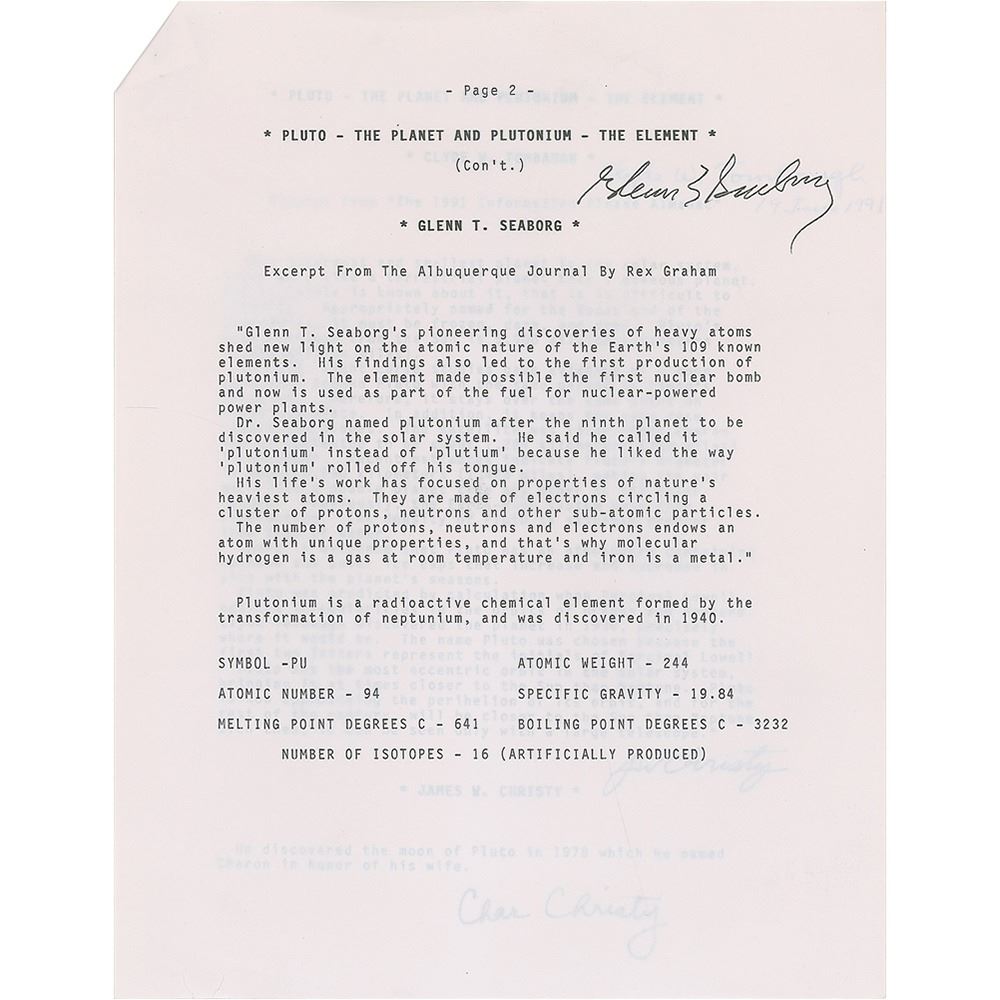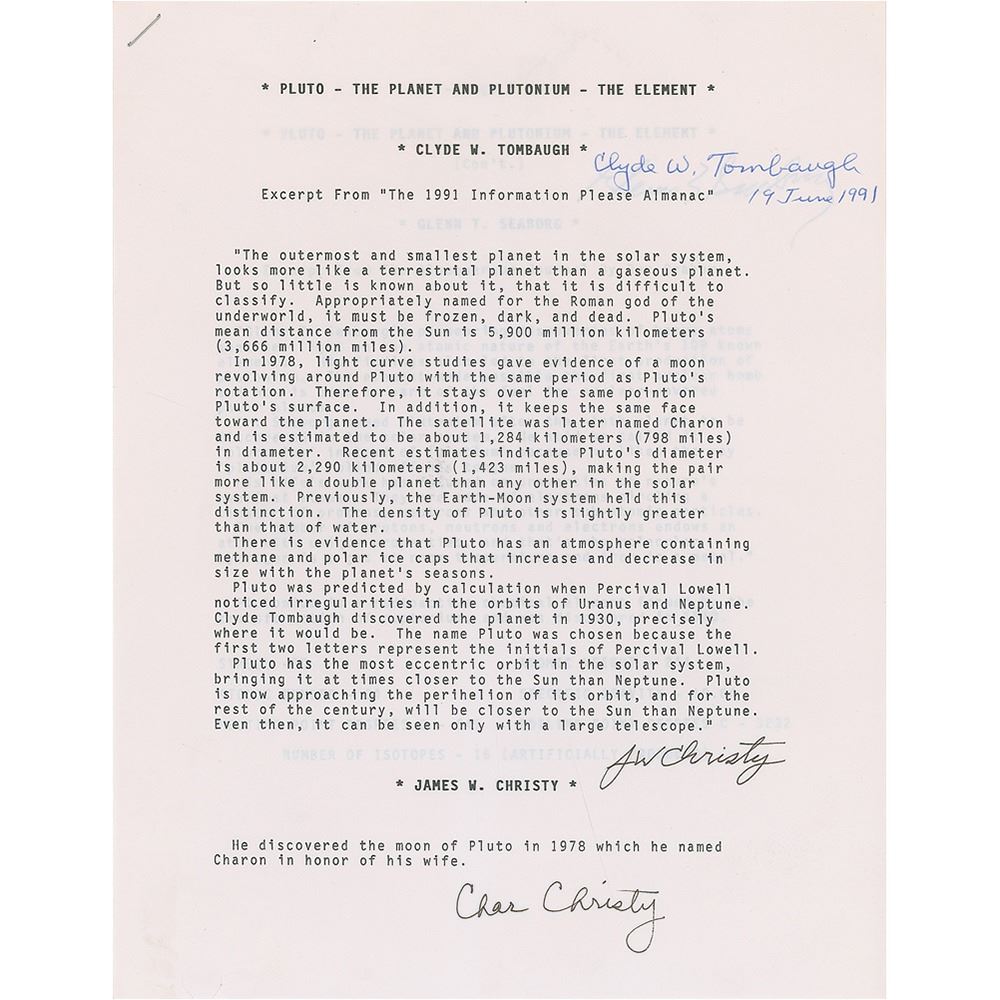 Typescript containing biographies and excerpts from works by Clyde W. Tombaugh, James W. Christy, and Glenn T. Seaborg, two pages, 8.5 x 11, with the first two mentioned signing on the first page in blue ballpoint, "Clyde W. Tombaugh, 19 June 1991," and in black ink, "J. W. Christy," and the latter signing the second page in black ink, "Glenn T. Seaborg.' The first sheet is also signed by Christy's wife Charlene "Char" Christy, the namesake of the Pluto moon. In fine condition.