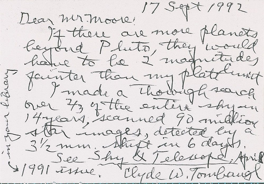 American astronomer (1906–1997) best known for discovering Pluto in 1930. ALS, one page, 5 x 3.5, September 17, 1992. Letter to an admirer. In part: “If there are more planets beyond Pluto, they would have to be 2 magnitudes fainter than my plate limit. I made a thorough search over 2/3 of the entire sky in 14 years, scanned 90 million star images, detected by a 3 1/2 mm shift in 6 days.” In fine condition.