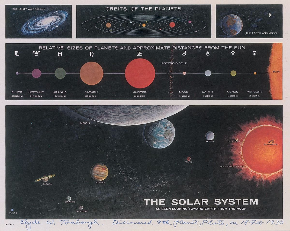 American astronomer (1906–1997) best known for discovering Pluto in 1930. Official color 10 x 8 NASA lithograph depicting various celestial features of the solar system, signed in the lower border in blue ballpoint, “Clyde W. Tombaugh. Discovered 9th planet, Pluto, on 18, Feb 1930.” In fine condition, with a trivial crease to upper left corner tip.