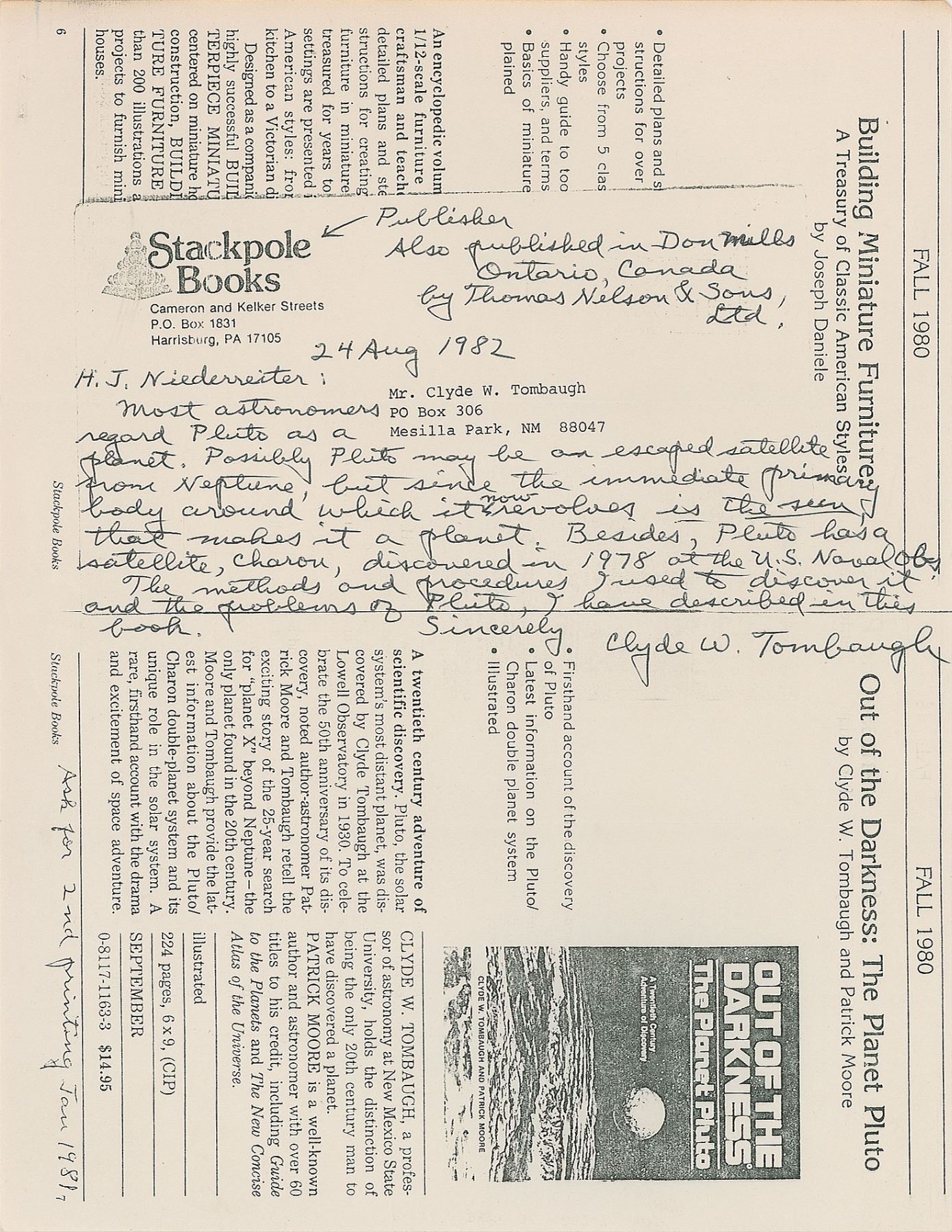 ALS, one page on an 8.5 x 11 copy of a Stackpole Books catalog page for his book Out of the Darkness: The Planet Pluto, August 24, 1982. Letter to H. J. Niederreiter, in full: "Most astronomers regard Pluto as a planet. Possibly Pluto may be an escaped satellite from Neptune, but since the immediate primary body around which it now revolves is the sun, that makes it a planet. Besides, Pluto has a satellite, Charon, discovered in 1978 at the U. S. Naval Obs. The methods and procedures I used to discover it and the problems of Pluto, I have described in this book." Tombaugh draws an arrow pointing to the publishing company's logo, and writes: "Publisher. Also published in Don Mills, Ontario, Canada, by Thomas Nelson & Sons, Ltd." In fine condition.