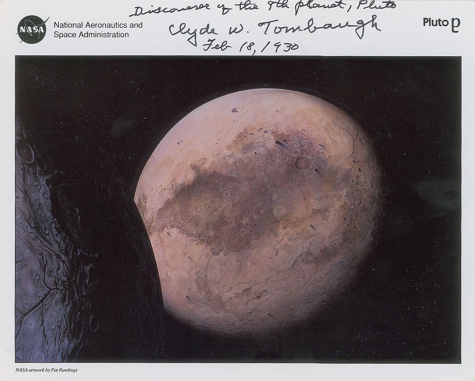 Official color 10 x 8 NASA lithograph of an artist's conception of the planet Pluto, signed in black felt tip, "Discoverer of the 9th planet, Pluto, Clyde W. Tombaugh, Feb. 18, 1930." In very fine condition.