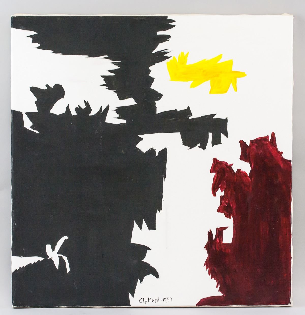 Oil on canvas. Featuring abstract composition in black, white, red, and yellow. Signed "Clyfford" in the bottom center with "1957" inscribed beside the signature. Attributed to Clyfford Still (1904-1980, American). 48 x 46 cm (19 x 18 inches). PROVENANCE: This lot carries limited provenance from a Southern Ontario estate