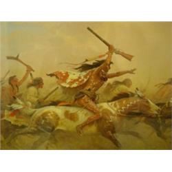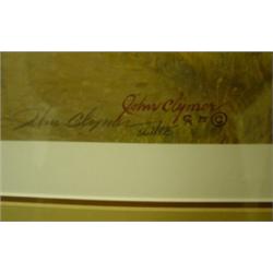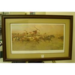 Limited Edition print (567/975). John Clymer. "Crazy Horse" - 1975. Depicts Indians in battle with Crazy Horse leading the charge. Image 13-1/2" x 26-1/2". Overall - 24-1/2" x 37". Western American Heritage Prints. Signed in pencil on lower right. Professionally framed. Condition: Excellent with papers.