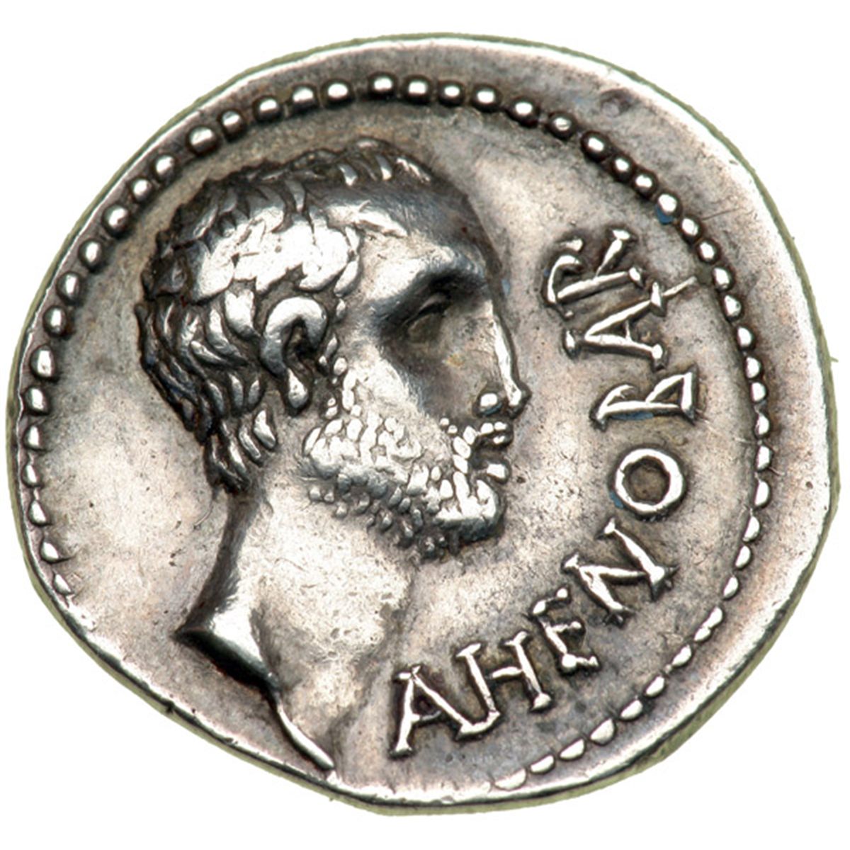 During the Imperatorial era many chosen allegiances were broken and re-formed. Saluted as Imperator after his victory at Philippi, Ahenobarbus was appointed governor of Bithynia by Marc Antony. Denarii struck by Ahenobarbus were usually hurriedly fashioned and, like other Imperatorial issues, were often test cut, poorly centered on small flans and artistically inferior. This is the finest example this cataloguer has seen, and displays a particularly elegant portrait .