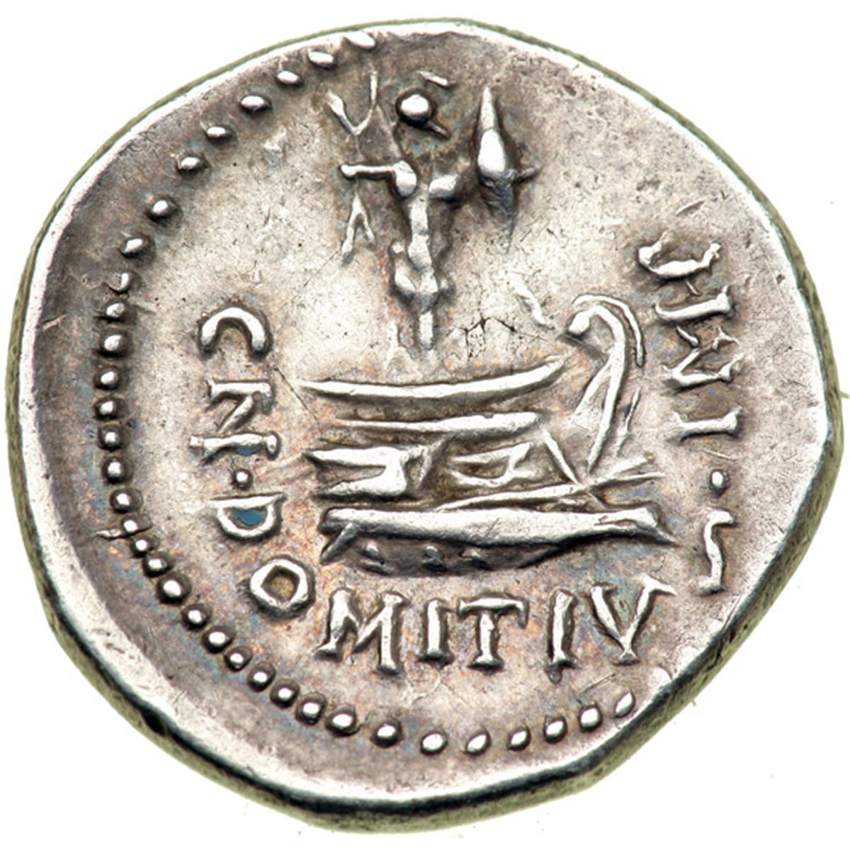 Cn. Domitius Ahenobarbus, d. 31 BC. AR Denarius struck at a moving mint (region of the Adriatic or Ionian Sea), 41 BC. AR Denarius struck at a moving mint (region of the Adriatic or Ionian Sea), 41 BC. Bare head right of Ahenobarbus. Reverse: Prow right surmounted by military trophy. Domitia 21; Cr. 519/2; Syd. 1177. Rare. Extremely Fine. .