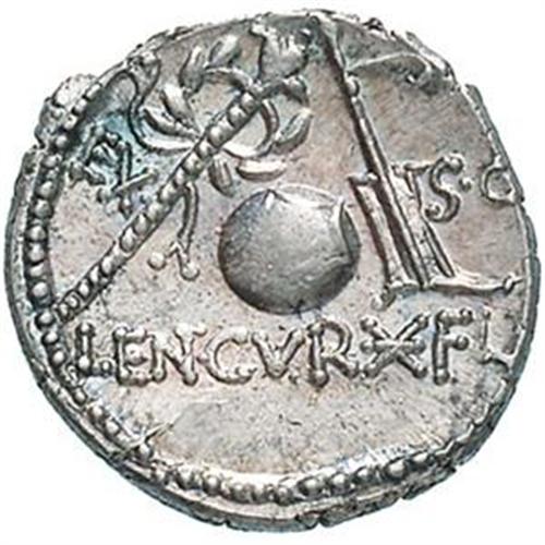 Repubblica Romana. Cn. Lentulus. Denarius, 76-75 a.C. D/ Busto del Genio del Popolo Romano a destra. Sopra, G.P.R. Dietro, scettro. R/ Globo terrestre tra scettro e timone. Sotto, LENT CVR X FL. Nel campo, EX S.C. Cr. 393/1b. B. (Cornelia) 55. gr. 3.82 AG. qFDC.