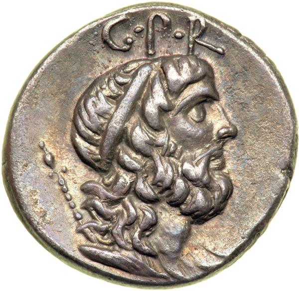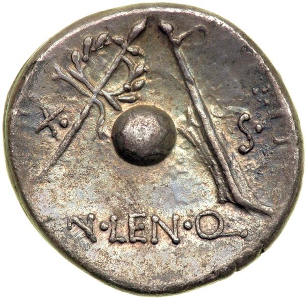 Cn. Lentulus, moneyer. AR Denarius minted perhaps in Spain, c. 76-75 BC. Diademed bust right of the Genius of the Roman People. Reverse: Globe between rudder and scepter with wreath. Cornelia 54; Cr. 393/1a; Syd. 752. Beautifully toned; Extremely Fine.