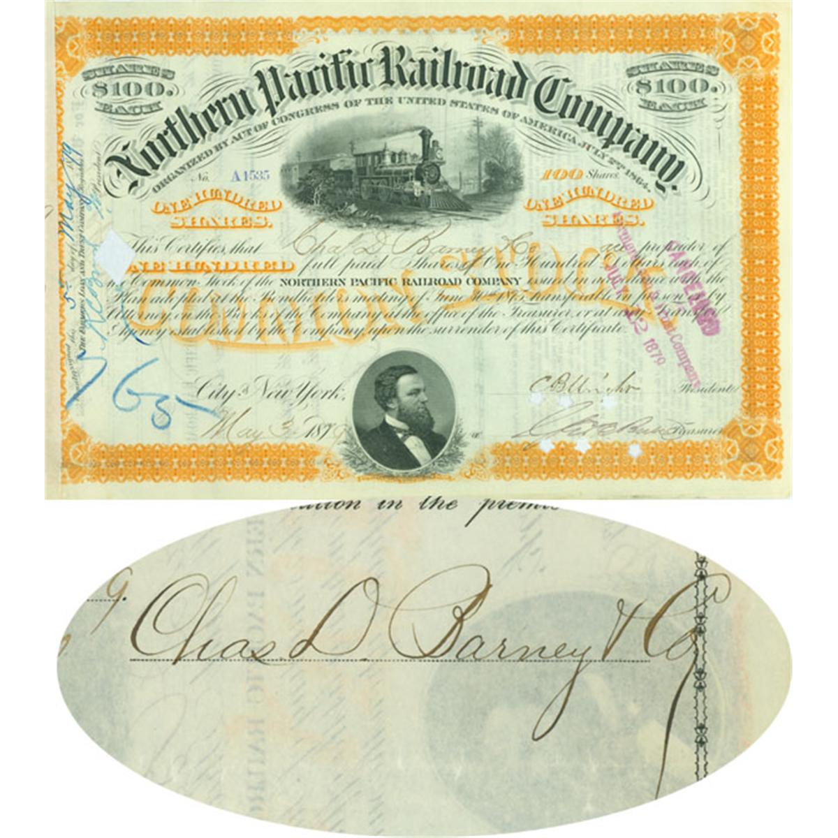1879, Northern Pacific Railway Stock certificate for 100 shares. Engraved vignette of a steam locomotive at top center, nice portrait vignette of Frederick Billings at bottom issued to and signed by CHARLES D. BARNEY & CO. Smith Barney is a financial success story that dates back to 19th century Philadelphia. A young broker named Charles D. Barney, founded his firm in 1873 and a young investment banker, Edward B. Smith, started his in 1892. These pioneers of the American securities industry helped make Wall Street the world's financial capital. In 1873 Charles Barney, a stockbroker, founded Charles D. Barney & Co. 1892 Investment banker Edward Smith founds Edward B. Smith & Co. In 1938 Barney & Smith merge forming Smith Barney & Co. Today Smith Barney's nearly 12,400 Financial Consultants serve more than 7.5 million client accounts representing nearly $900 billion in client assets. . Signed on verso: “Chas. D. Barney & Co.”. Orange/Black. Punch hole cancellations not affecting signature. Very Fine