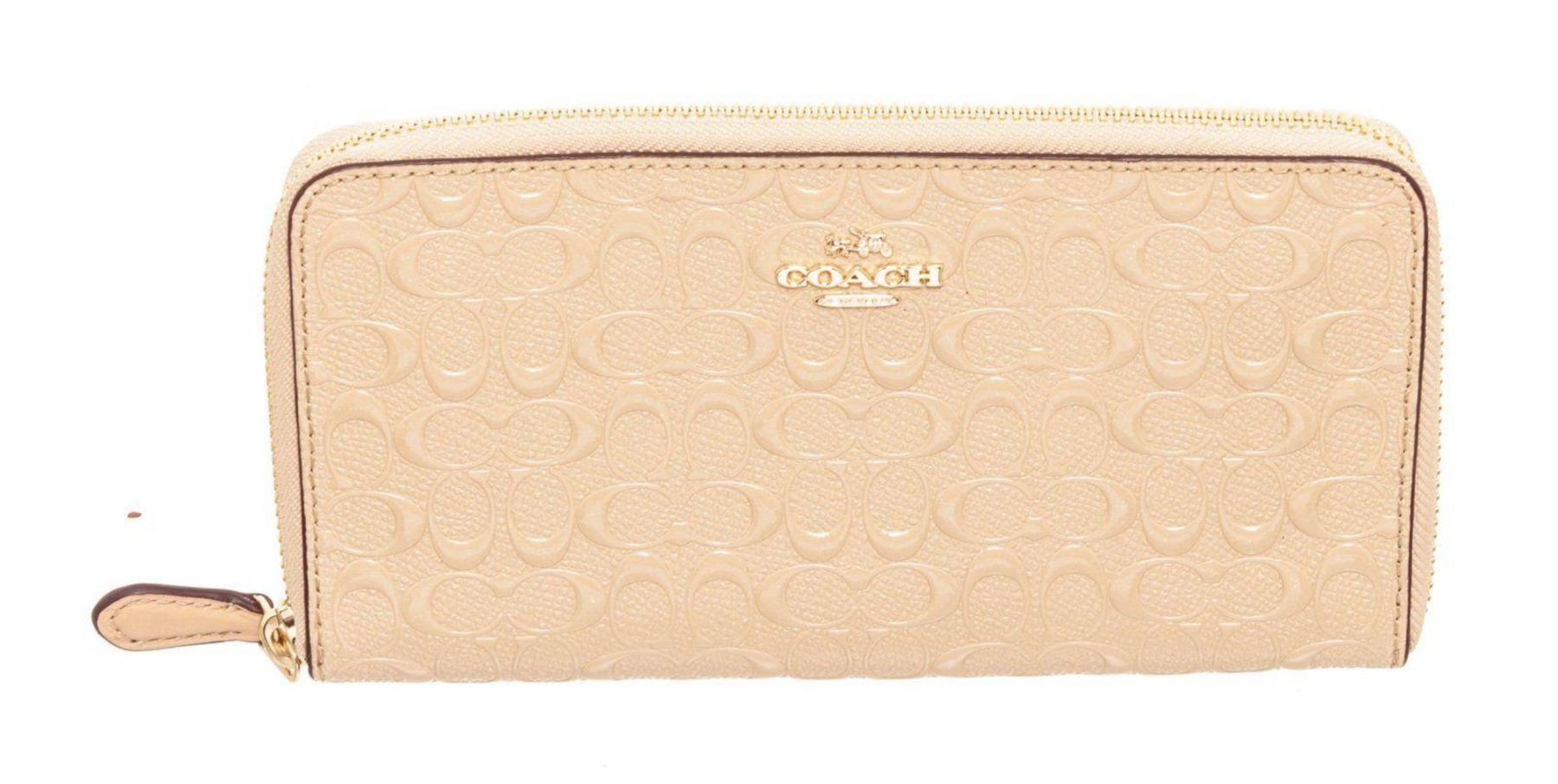 Coach Biege debossed logo leather zippy wallet with gold-tone hardware, logo placard at front, five interior compartments; one with zip closure, twelve cardholder slots and overall zip around closure. Measurements: Length: 8.4 in / 21 cm Width: 0.85 in / 2 cm 4.5 in / 11 cmCONDITION: Pre-Owned Good overall, please see photographs for detail.