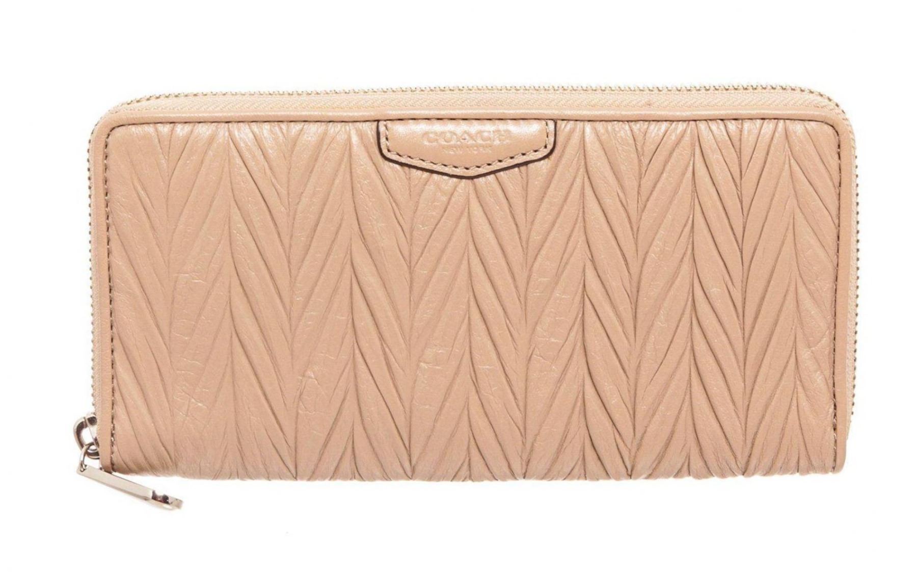 Coach beige textured leather zippy wallet with silver-tone hardware, embossed logo at front, six interior compartments; one with zip closure, twelve cardholder slots and overall zip around closure. Measurements: Length: 8.25 in / 21 cm Width: 1 in / 3 cm 4.5 in / 11 cmCONDITION: Pre-Owned Good overall, please see photographs for detail.