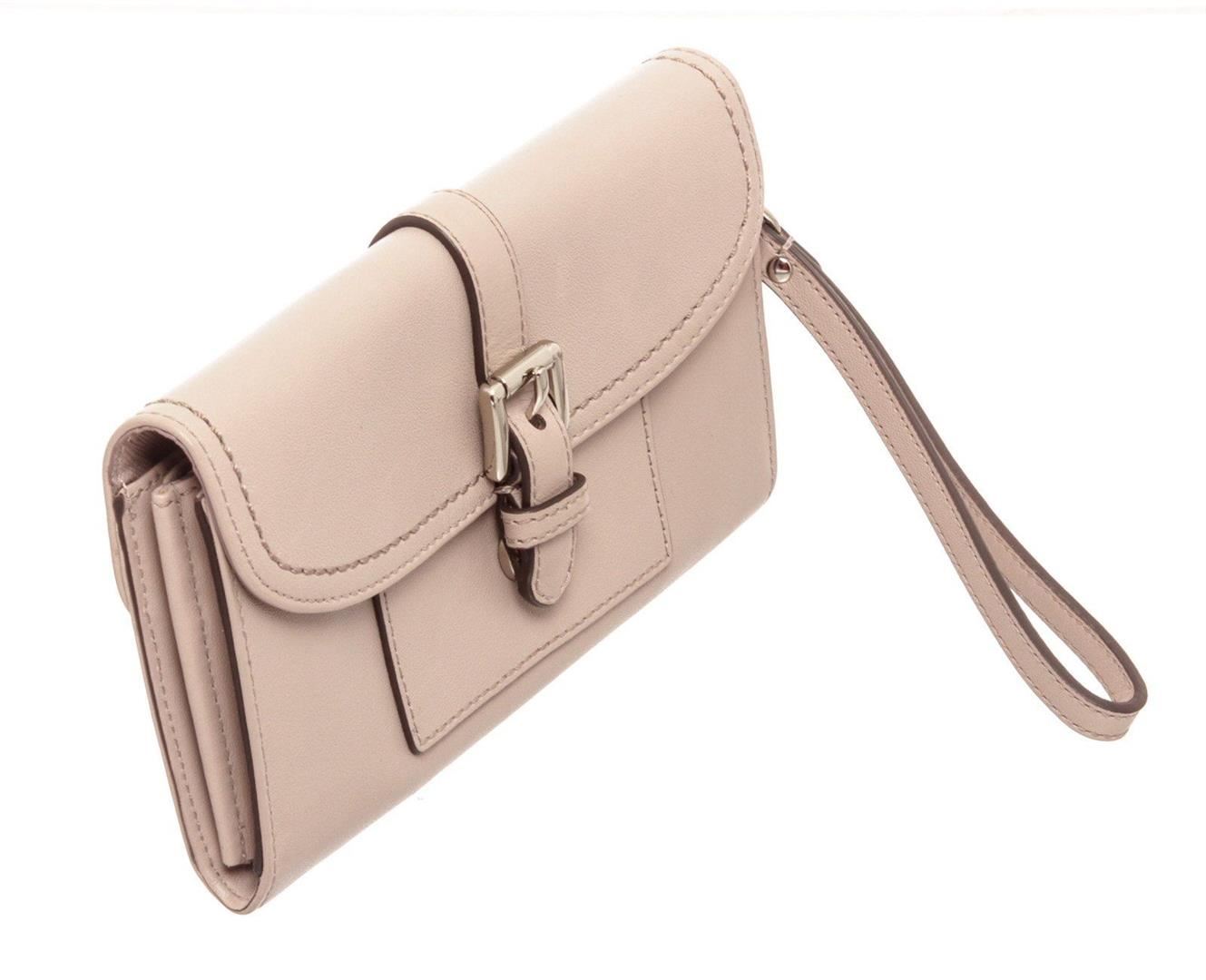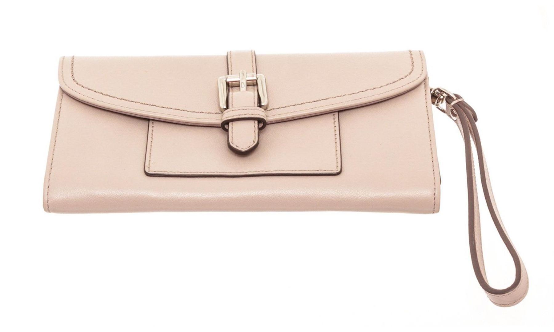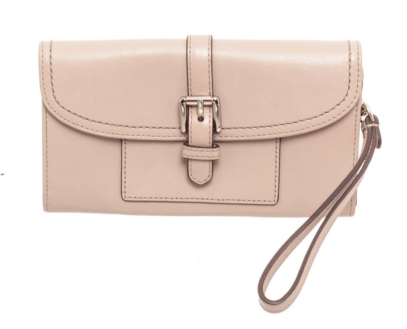 Coach beige leather Hybrid wristlet wallet with silver-tone hardware, single flat wristlet strap, single slip pocket under front flap, five interior compartments; one with zip closure, eight cardholder slots and overall snap closure at front featuring a buckle style.