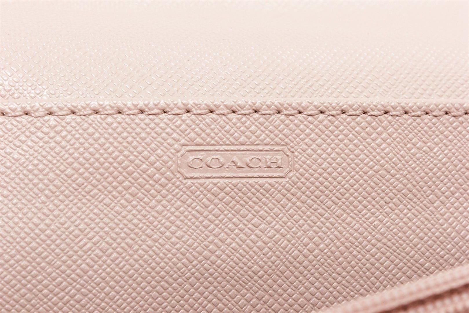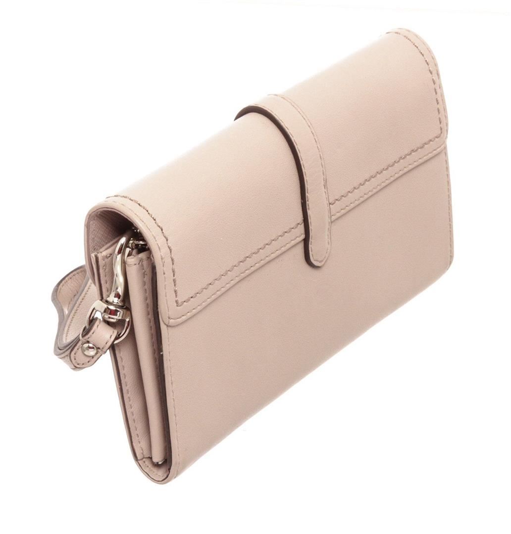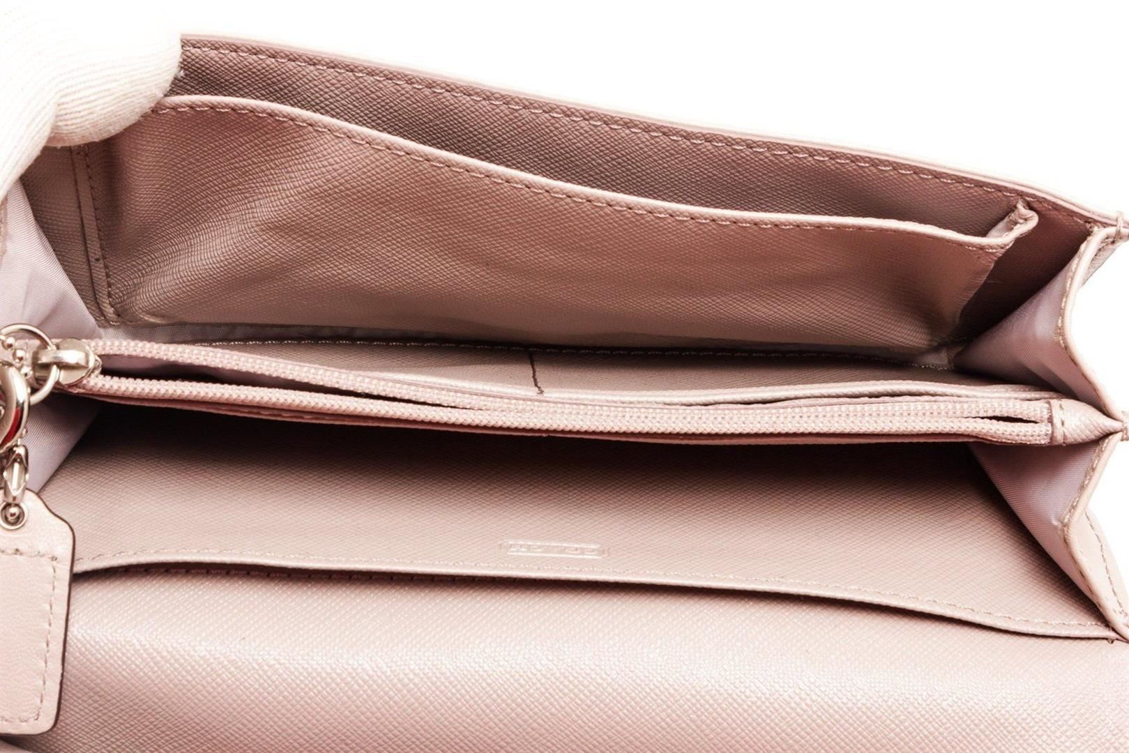 Coach beige leather Hybrid wristlet wallet with silver-tone hardware, single flat wristlet strap, single slip pocket under front flap, five interior compartments; one with zip closure, eight cardholder slots and overall snap closure at front featuring a buckle style.
