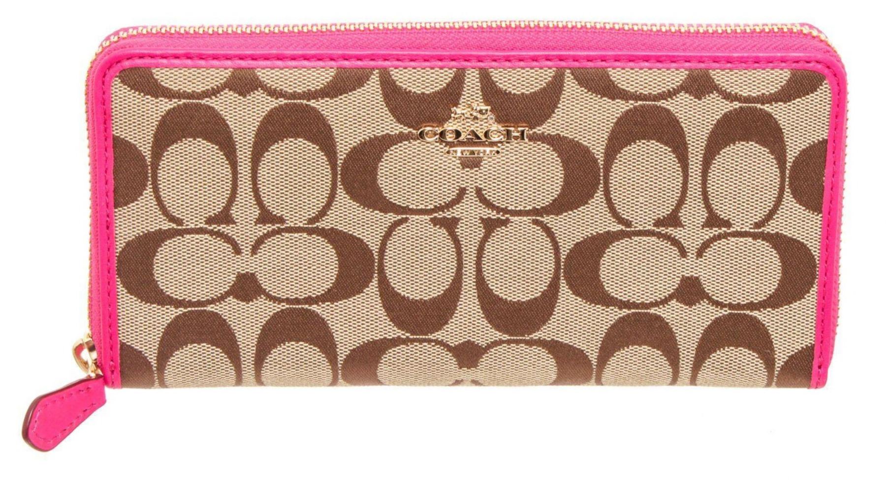Coach beige signature PVC canvas zippy wallet with gold-tone hardware, logo placard at front, single slip pocket at back, pink leather trim, pink canvas and leather interior lining, six interior compartments; one with zip closure, twelve cardholder slots and overall zip around closure. Measurements: Length: 8.5 in / 22 cm Width: 0.75 in / 2 cm 4.4 in / 11 cmCONDITION: Pre-Owned Good overall, please see photographs for detail.