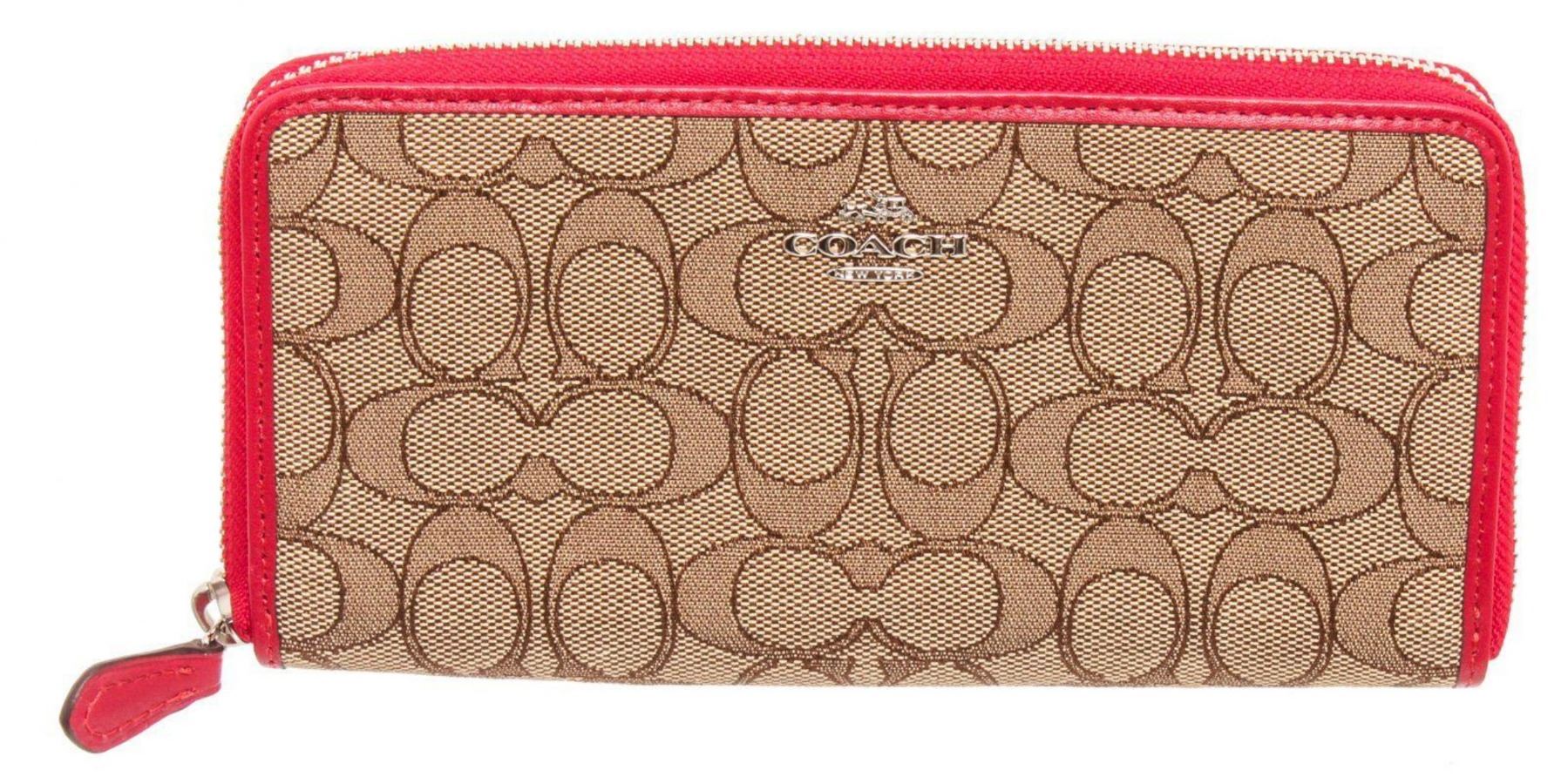 Coach beige signature PVC canvas zippy wallet with silver-tone hardware, logo placard at front, single slip pocket at back, red leather trim, red canvas and leather interior lining, six interior compartments; one with zip closure, twelve cardholder slots and overall zip around closure. Measurements: Length: 8.5 in / 22 cm Width: 0.75 in / 2 cm 4.4 in / 11 cmCONDITION: Pre-Owned Good overall, please see photographs for detail.