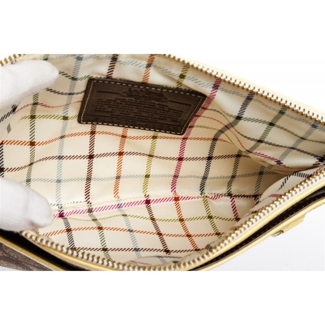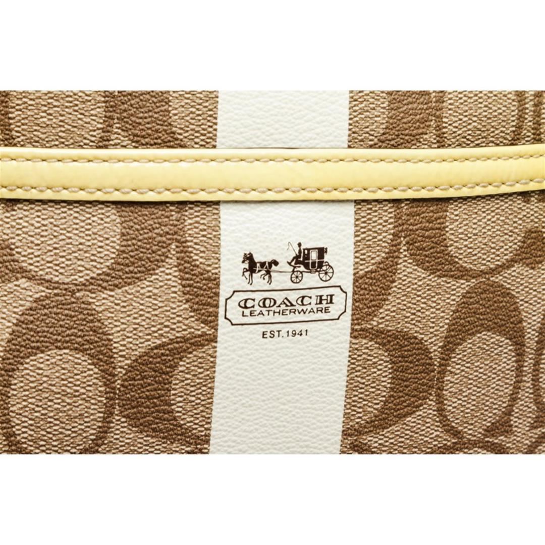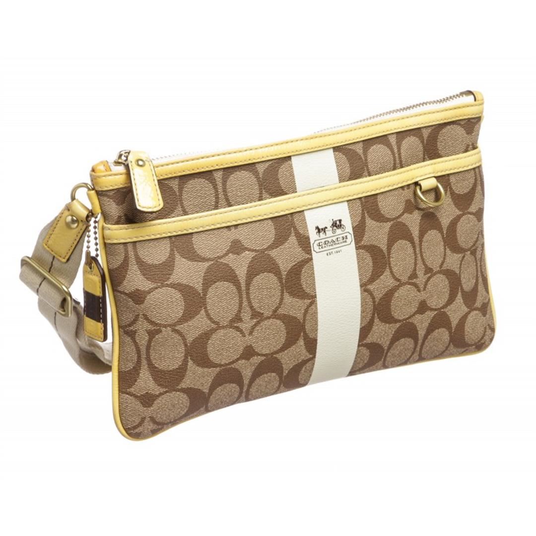 Yellow and beige coasted canvas monogram shoulder bag contains and overall zipper closure. Interior is fabric lined. Exterior contains front and back slip pocket with snap closure at front, single D-ring and adjustable strap. Item is Pre-Owned.