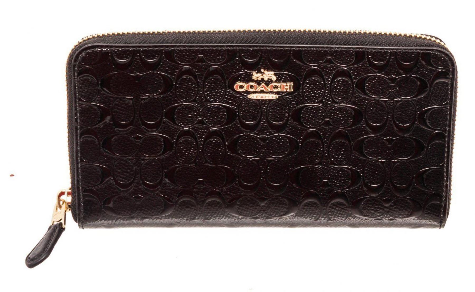 Coach black debossed logo leather zippy wallet with gold-tone hardware, logo placard at front, five interior compartments; one with zip closure, twelve cardholder slots and overall zip around closure. Measurements: Length: 8.4 in / 21 cm Width: 0.85 in / 2 cm 4.5 in / 11 cmCONDITION: Pre-Owned Good overall, please see photographs for detail.