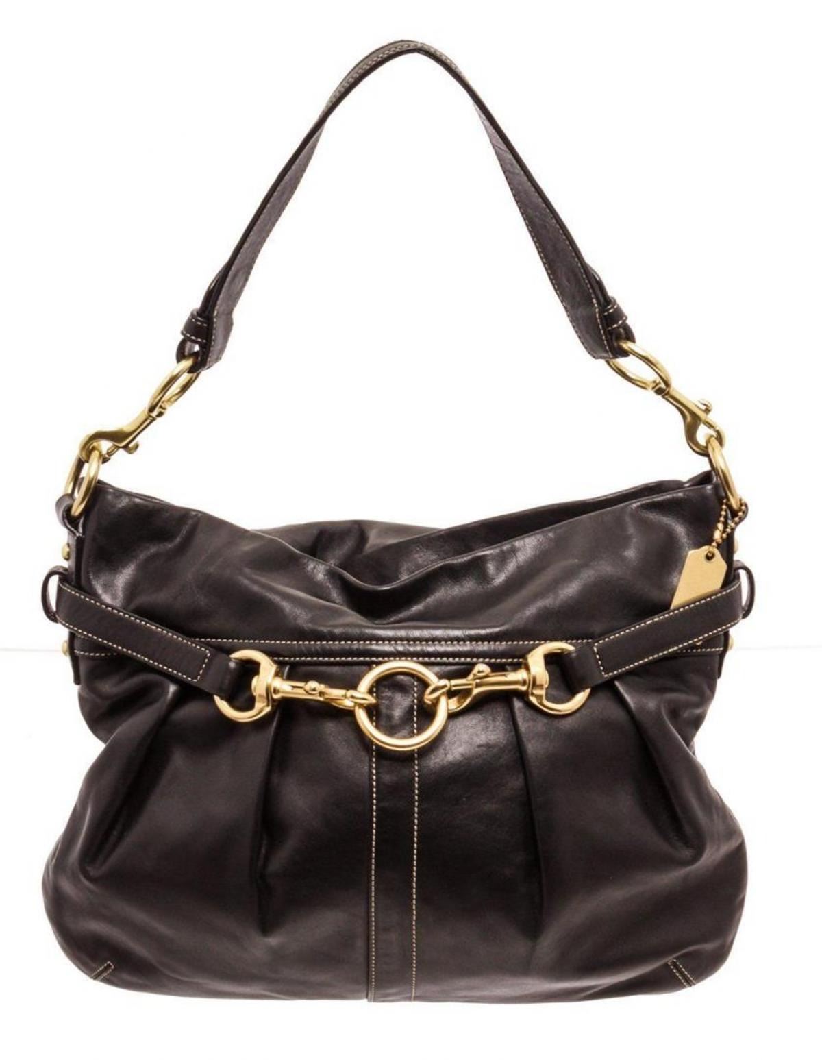 Coach black leather Hampton satchel with gold-tone hardware, single flat shoulder strap, black satin interior lining, three interior pockets; one with zip closure and overall zip closure at top. Measurements: Length: 14 in / 36 cm Width: 4.5 in / 11 cm 12 in / 30 cmCONDITION: Pre-Owned Good overall, please see photographs for detail.