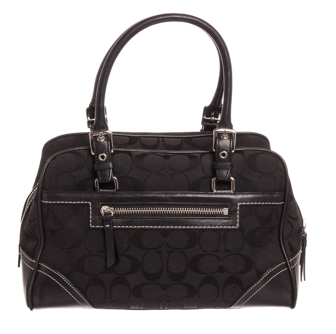 Black monogram canvas leather Coach bag with silver-tone hardware, white accent stitching, dual rolled leather top handles, black leather trim, protective feet at base, black woven lining, and single zipper pocket at interior wall.