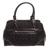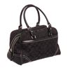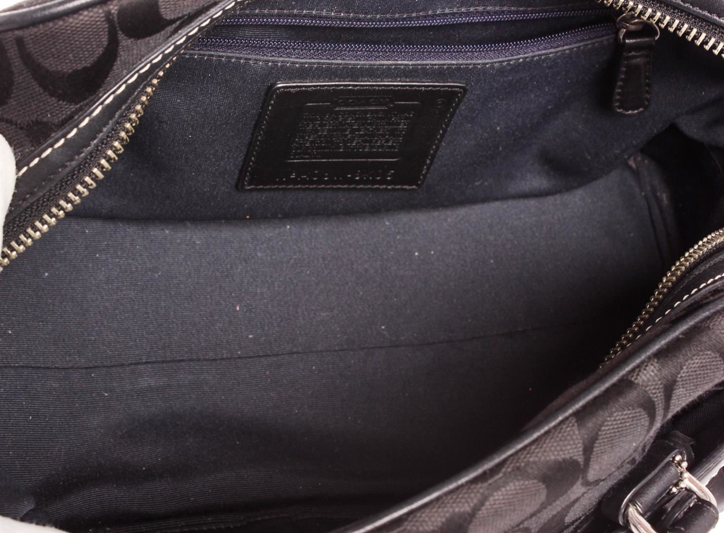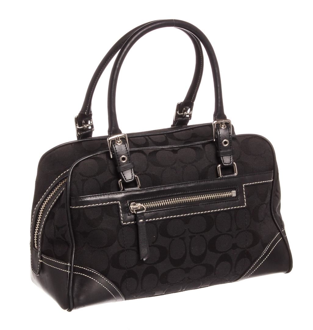 Black monogram canvas leather Coach bag with silver-tone hardware, white accent stitching, dual rolled leather top handles, black leather trim, protective feet at base, black woven lining, and single zipper pocket at interior wall.