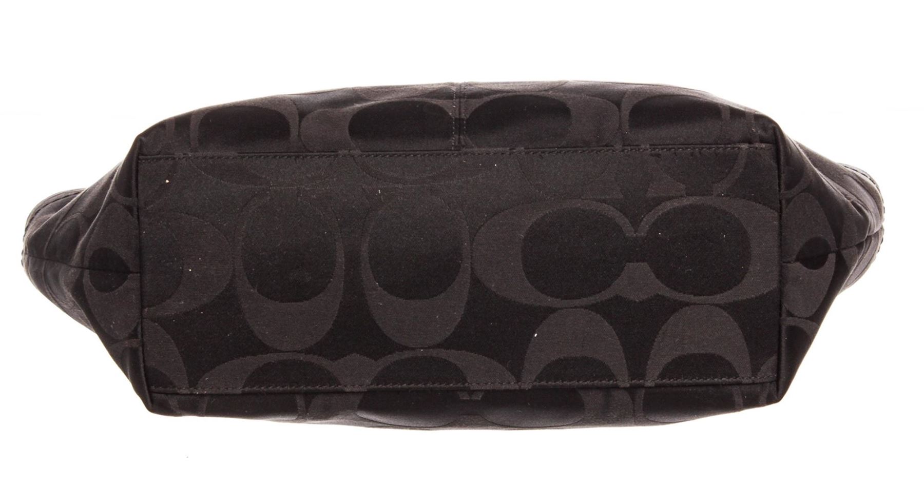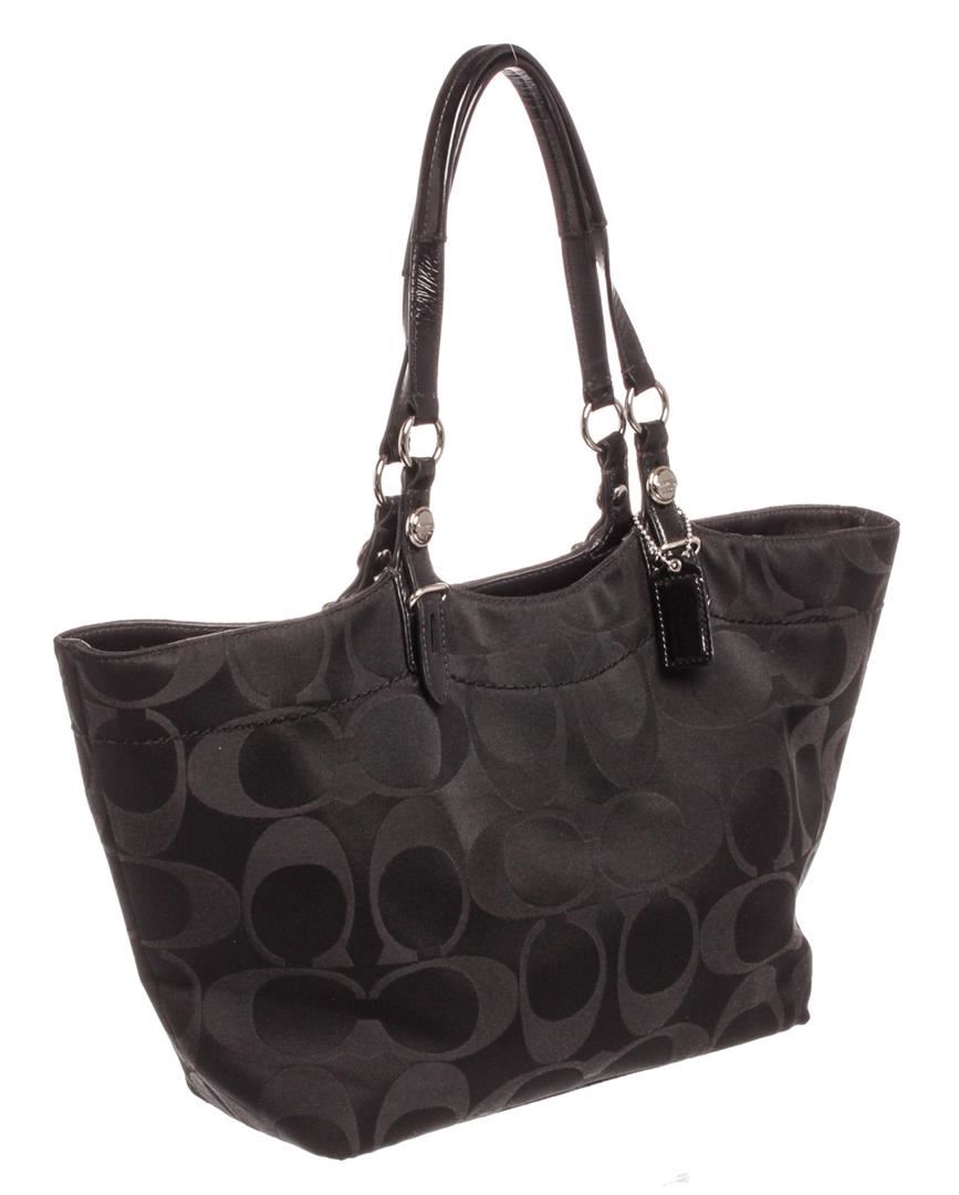 Crafted out of black monogram canvas, patent leather trim, and dual flat handles. Inner purple satin lining.
