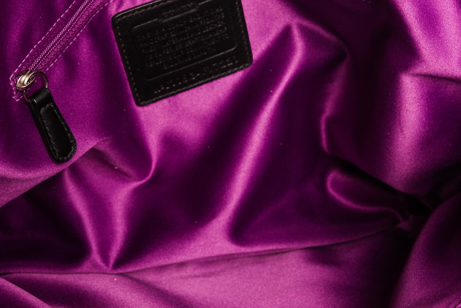 Crafted out of black monogram canvas, patent leather trim, and dual flat handles. Inner purple satin lining.
