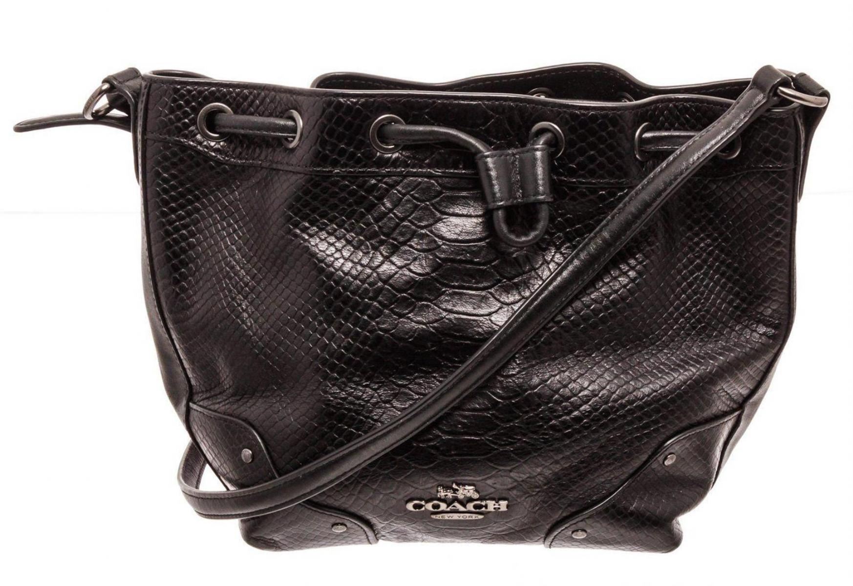 Coach Black Snakeskin Embossed Leather Mickey Drawstring Shoulder Bag. Coach black snakeskin embossed leather Mickey drawstring shoulder bag with silver-tone hardware, logo placard at front, one interior pocket with zip closure and overall drawstring clos