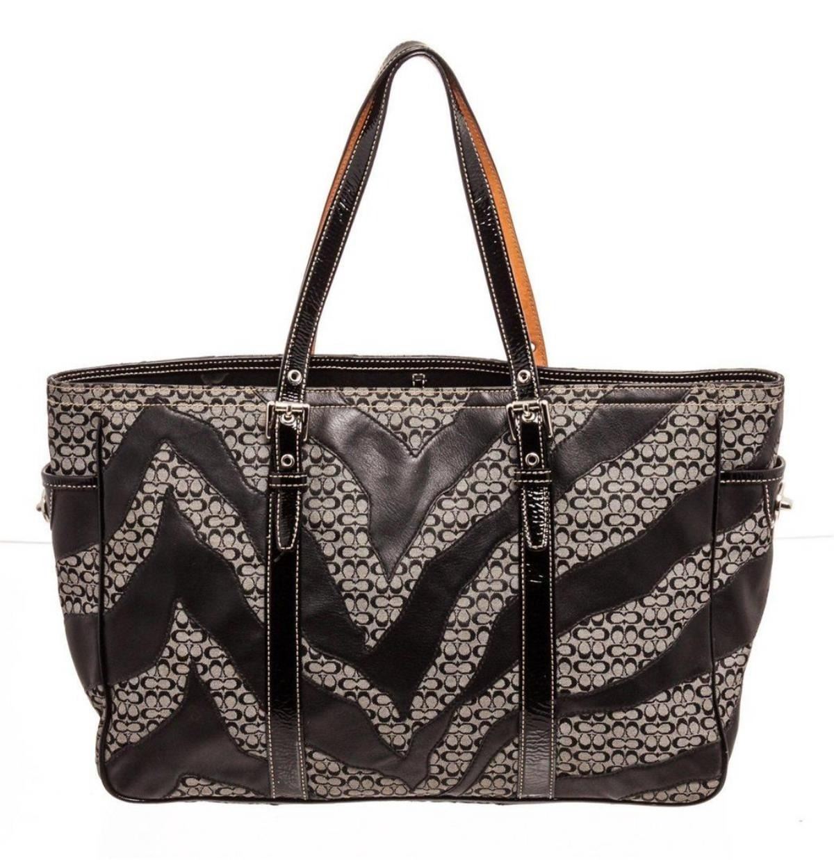 Coach Zebra Stripe canvas & leather shoulder bag with silver-tone hardware, dual flat patent leather top handles, two side pockets with turnlock closure, black canvas interior lining, three interior pockets; one with zip closure and overall clip closure at top. Measurements: Length: 18 in / 46 cm Width: 4.3 in / 11 cm 12.2 in / 31 cmCONDITION: Pre-Owned Good overall, please see photographs for detail.