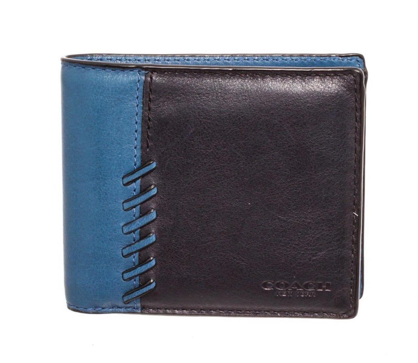 Coach blue & black leather RNR compact ID wallet, embossed logo and stitching embellishments at front, leather interior lining, one bill compartment at top, two interior slip pockets, eight cardholder slots, removable ID holder with three card slots and overall bifold closure. Measurements: Length: 4.35 in / 11 cm Width: 0.75 in / 2 cm 3.75 in / 10 cmCONDITION: Pre-Owned Good overall, please see photographs for detail.