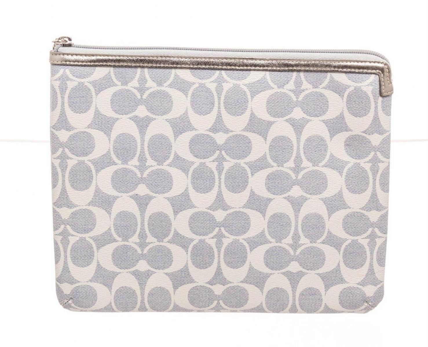 Coach blue monogram coated canvas ipad case with silver-tone hardware, tan padded canvas interior lining and overall zip closure at top. Measurements: Length: 10.3 in / 26 cm Width: 0.6 in / 2 cm 8.6 in / 22 cmCONDITION: Pre-Owned Good overall, please see photographs for detail.