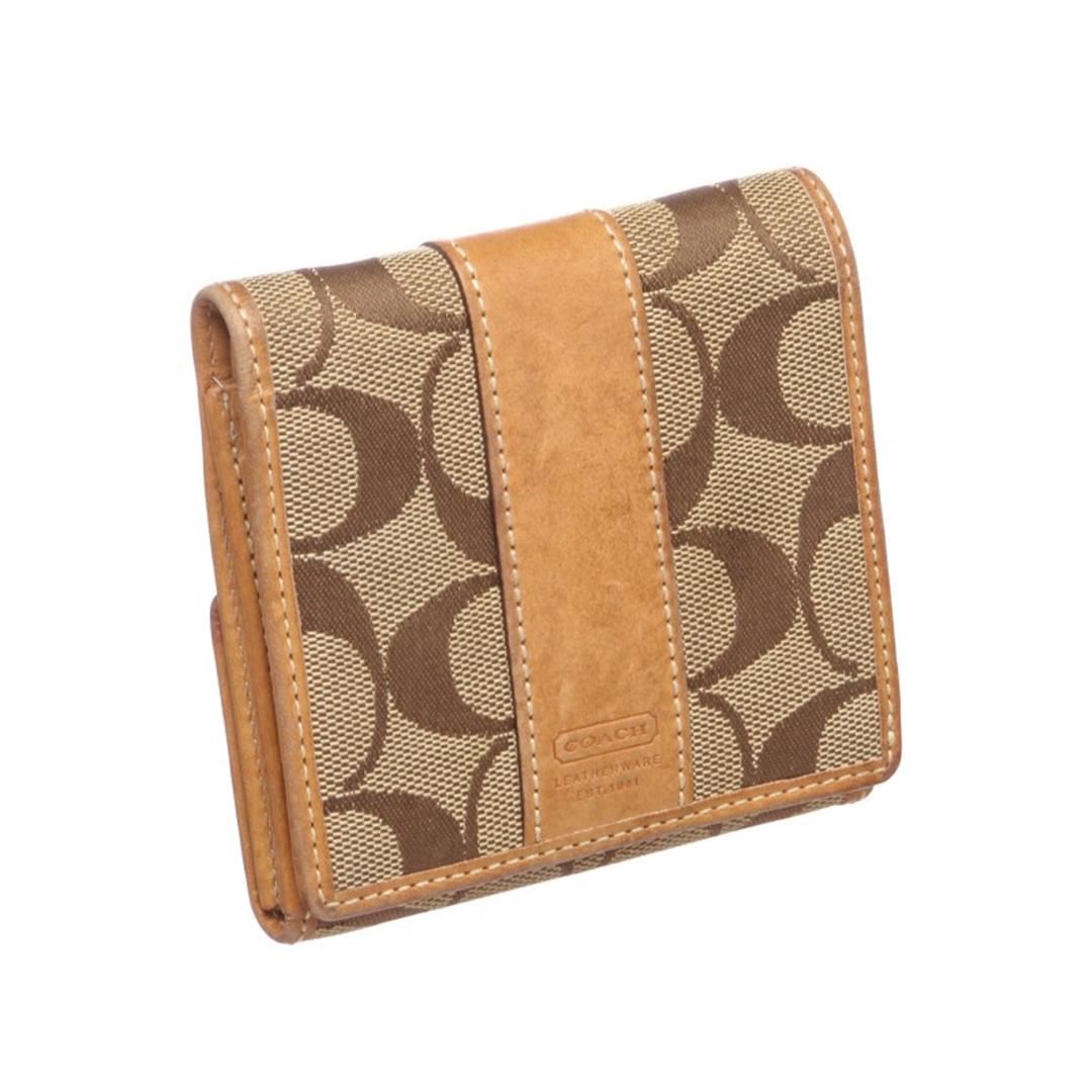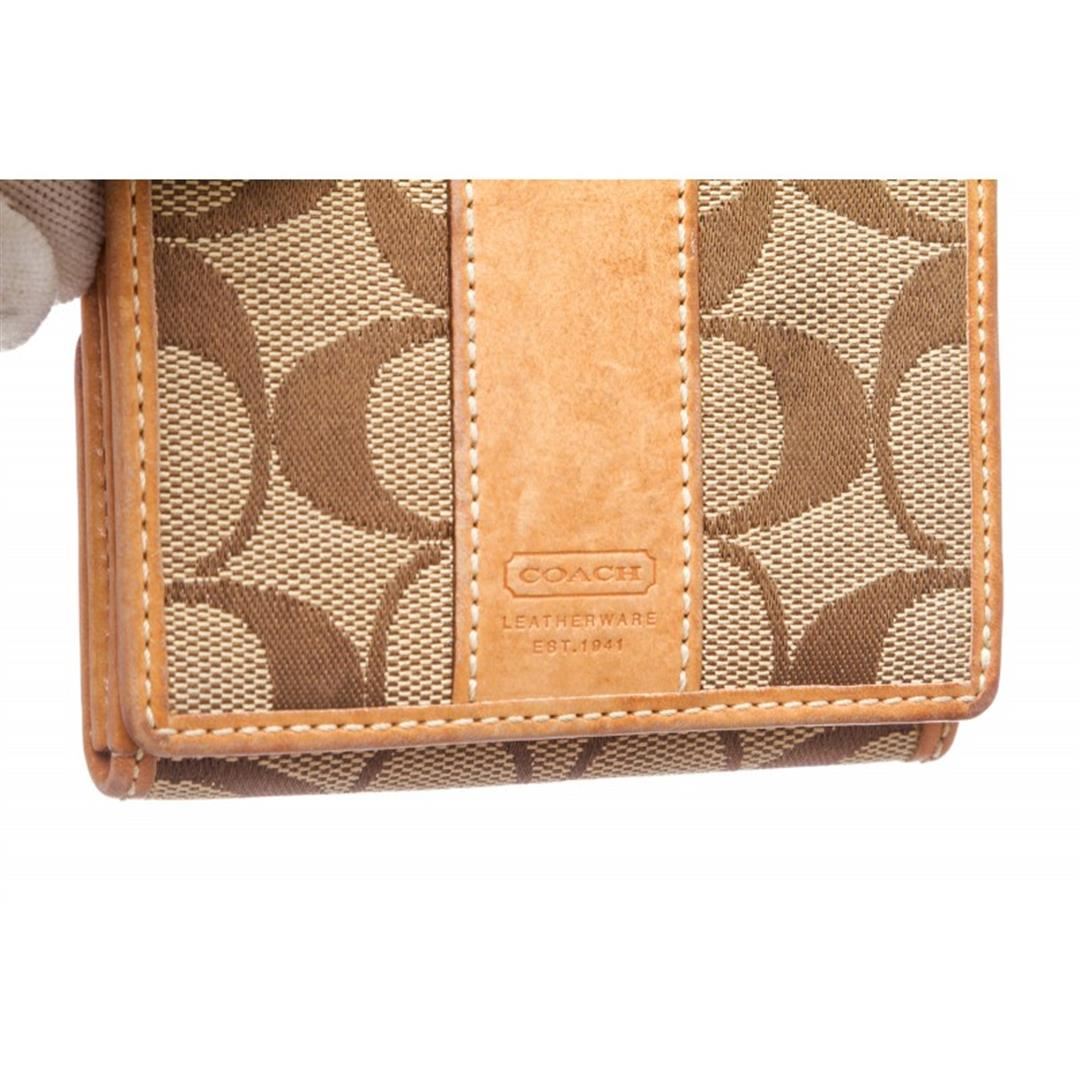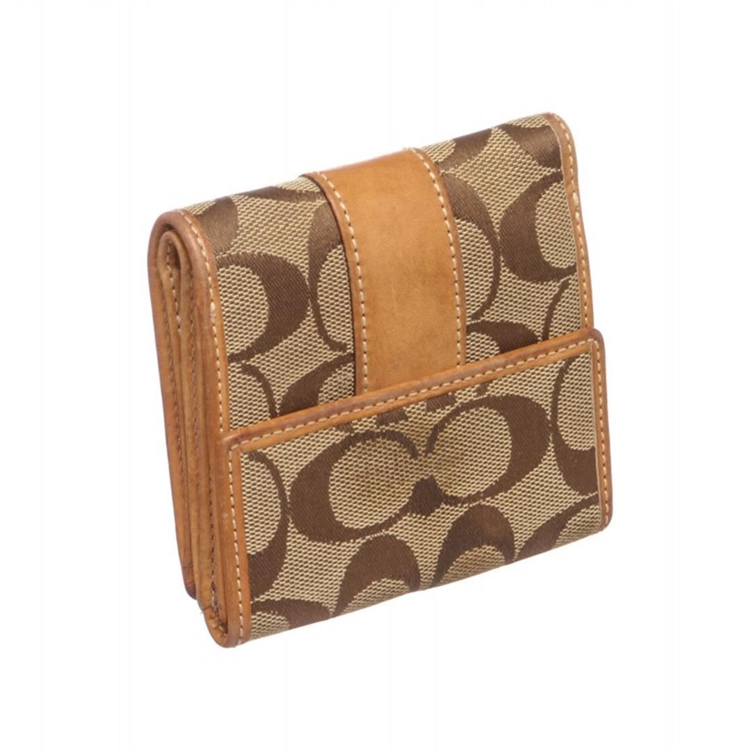 Crafted out of brown beige monogram canvas, tan leather trim, snap closure coin pocket at back, and snap closure front. Inner tan leather lining, six card slots, and dual bill pockets. Item is pre-owned.