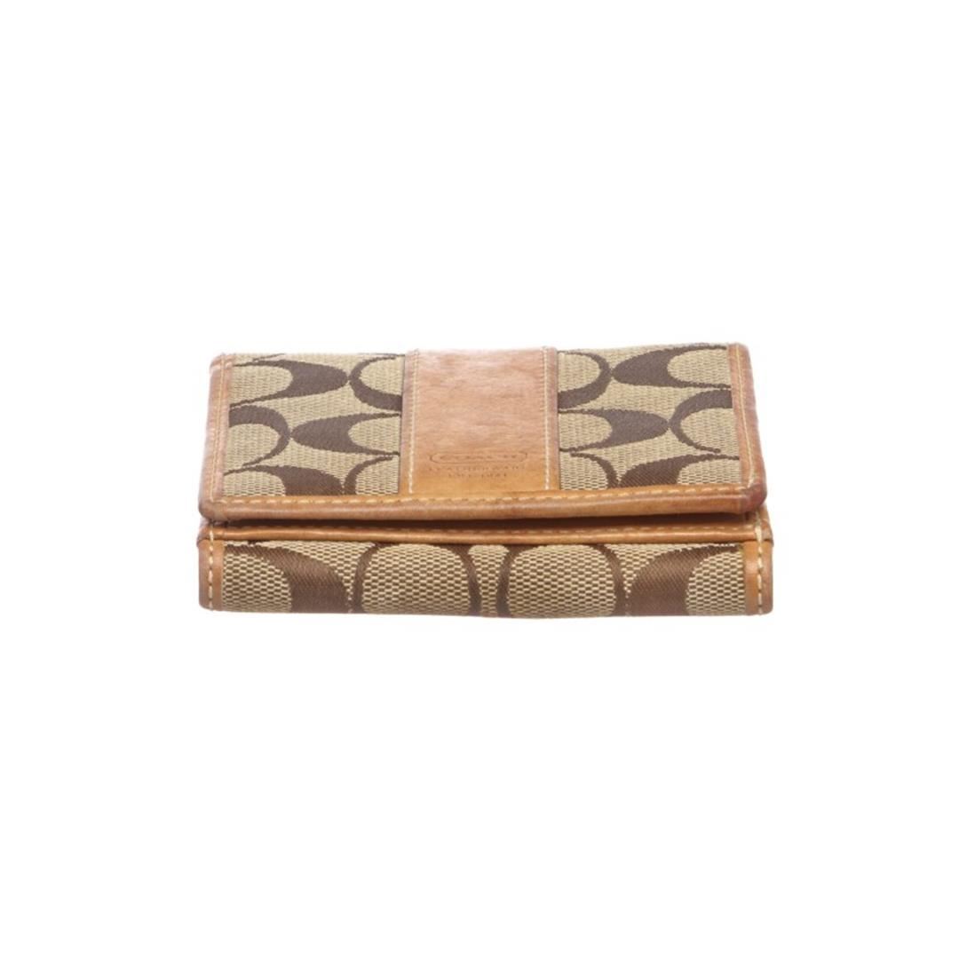 Crafted out of brown beige monogram canvas, tan leather trim, snap closure coin pocket at back, and snap closure front. Inner tan leather lining, six card slots, and dual bill pockets. Item is pre-owned.