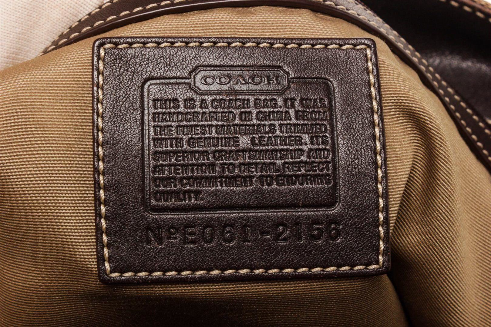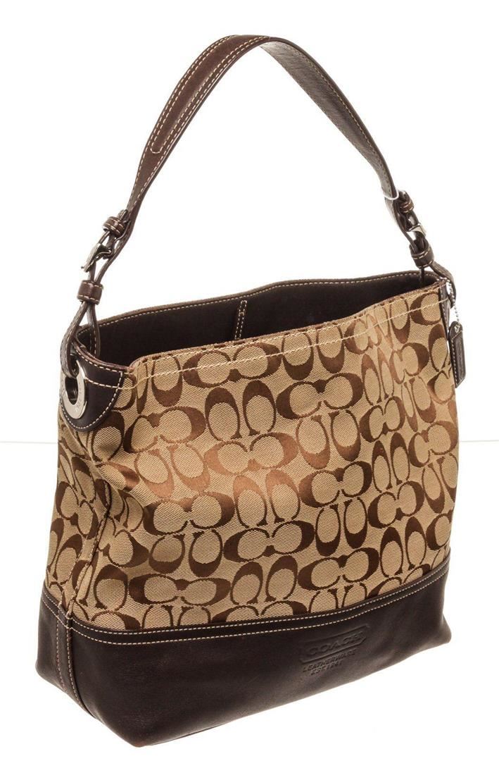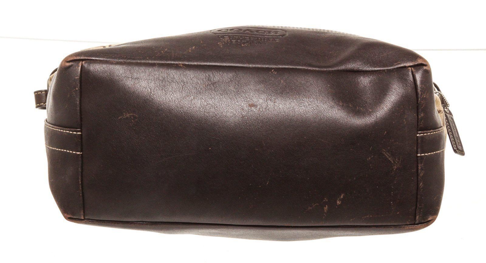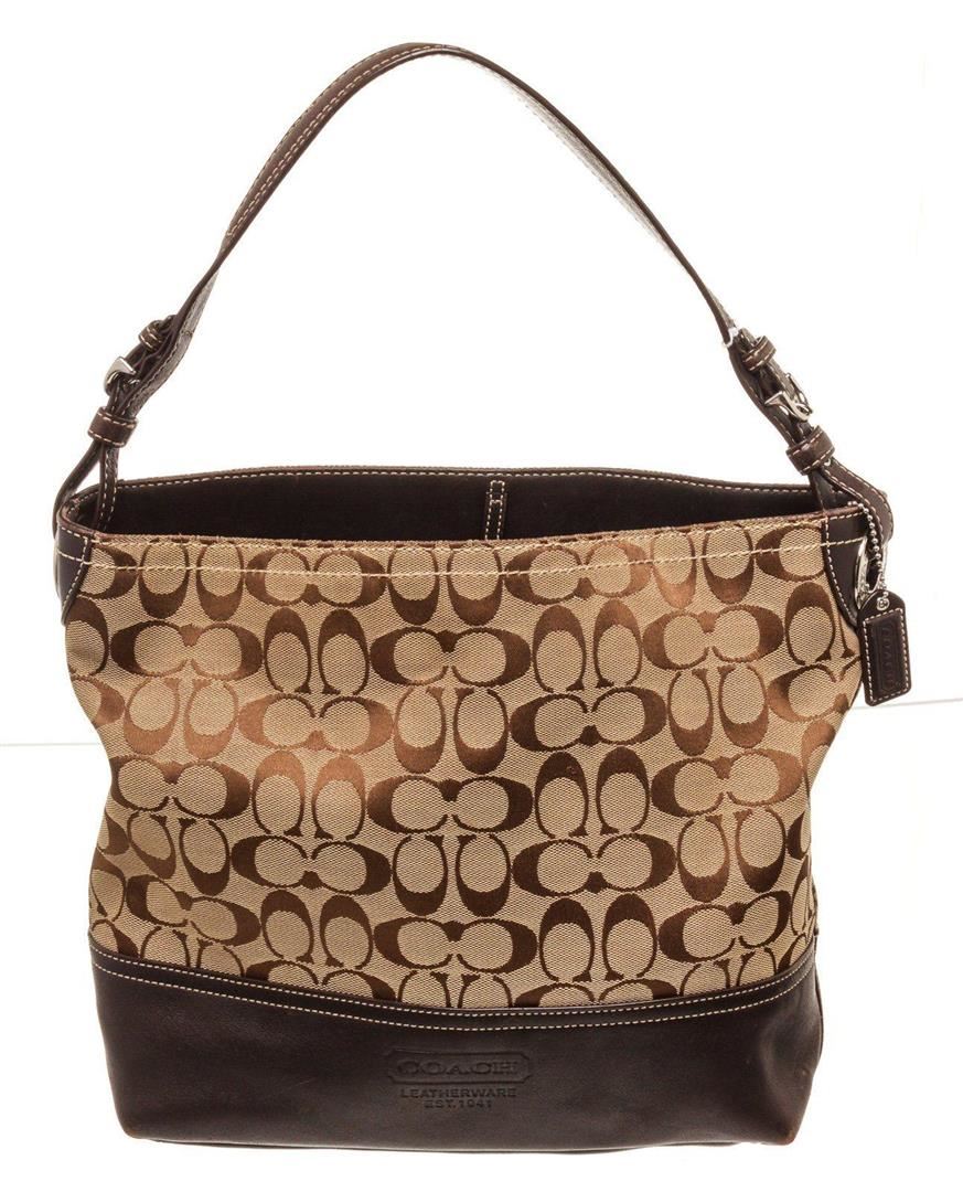 Coach Brown Canvas Leather Shoulder Bag with material canvas leather, gold-tone hardware, interior slip pocket, shoulder strap and flap closure.