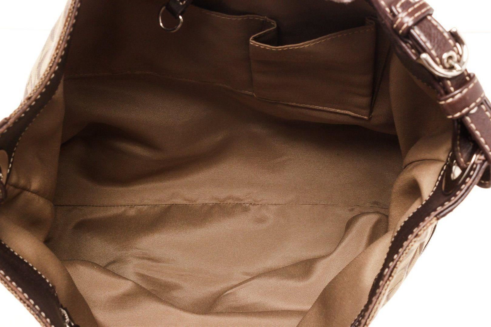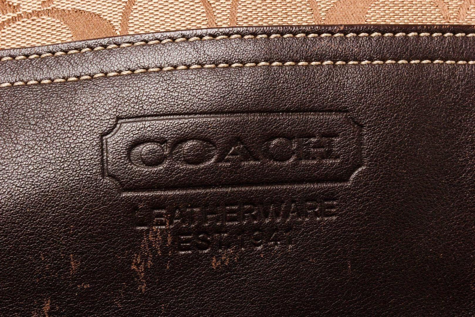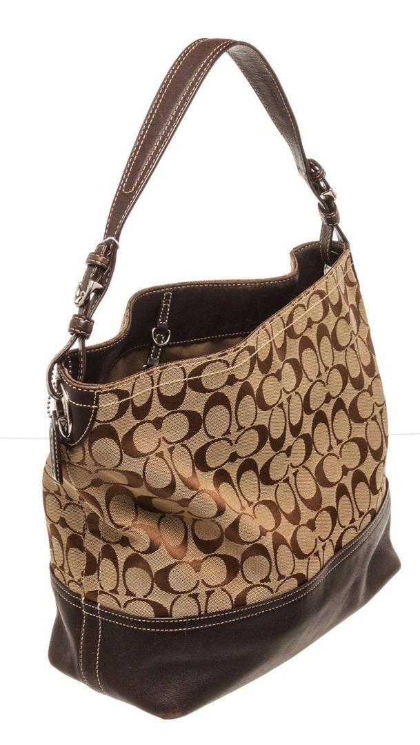 Coach Brown Canvas Leather Shoulder Bag with material canvas leather, gold-tone hardware, interior slip pocket, shoulder strap and flap closure.