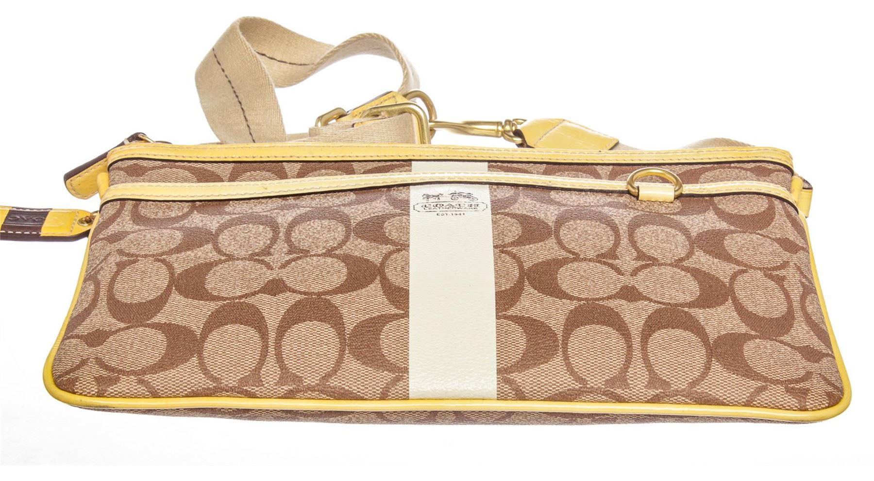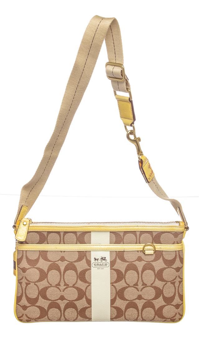 Crafted out of brown coated monogram canvas, zip top closure, leather trim, and single flat handle. Inner canvas lined.