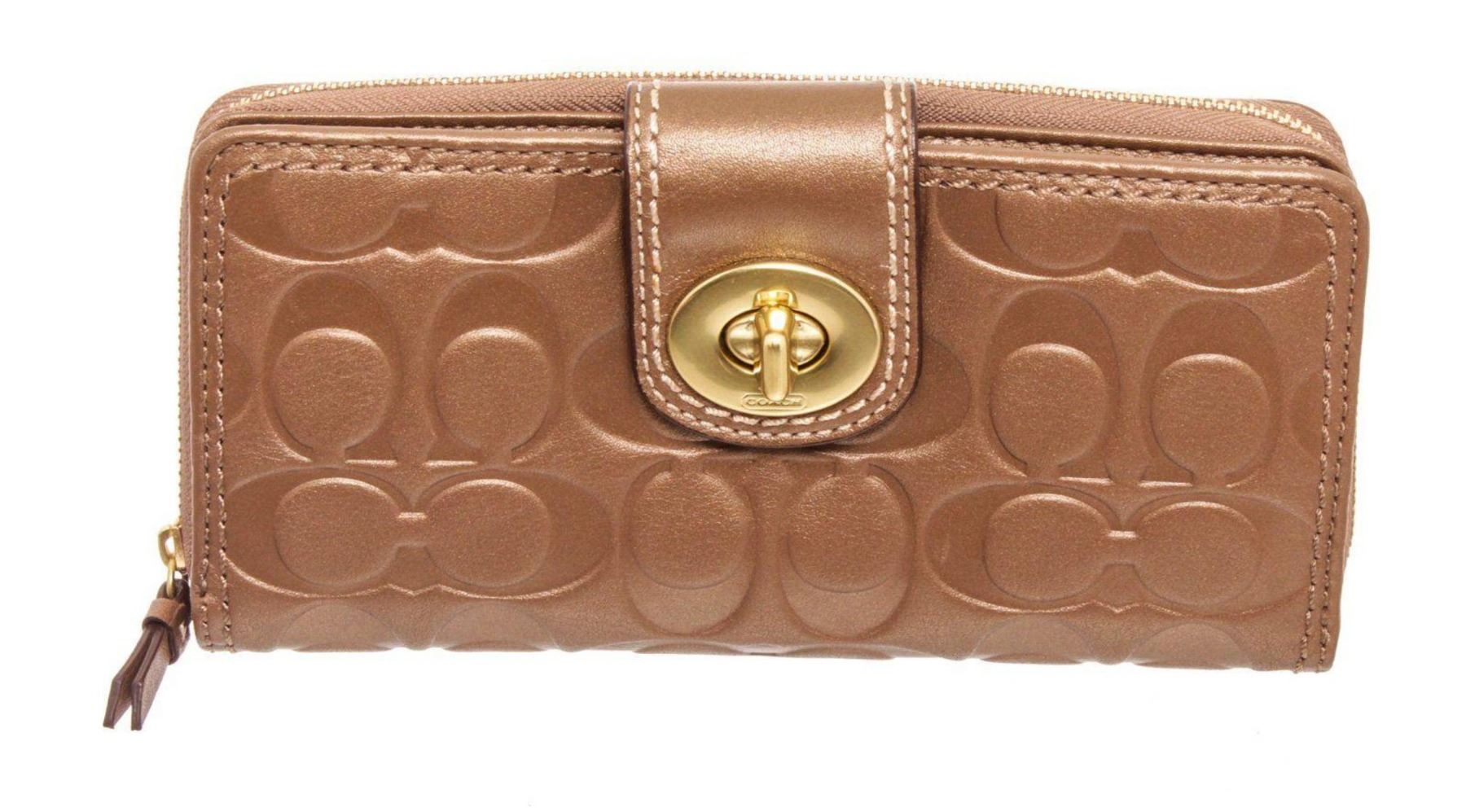 Coach brown embossed leather turnlock zippy wallet with gold-tone hardware, logo placard at front, two compartments, tan leather interior lining, first compartment with two pockets, thirteen cardholder slots and turnlock closure at front. second compartment has three pockets; one with zip closure and overall zip closure at top. Measurements: Length: 7.75 in / 20 cm Width: 1.15 in / 3 cm 4.25 in / 11 cmCONDITION: Pre-Owned Good overall, please see photographs for detail.