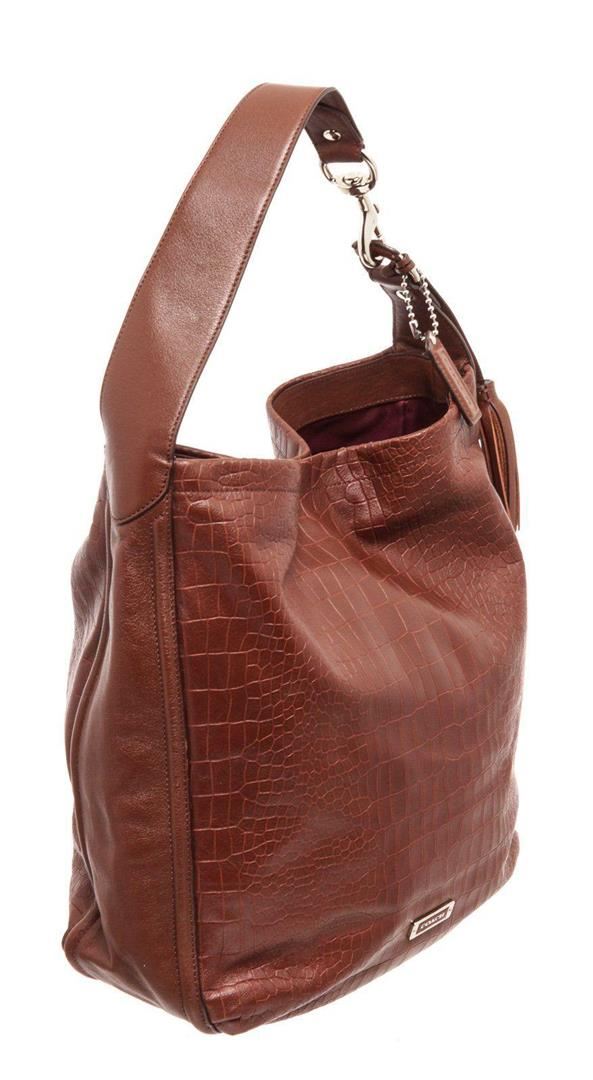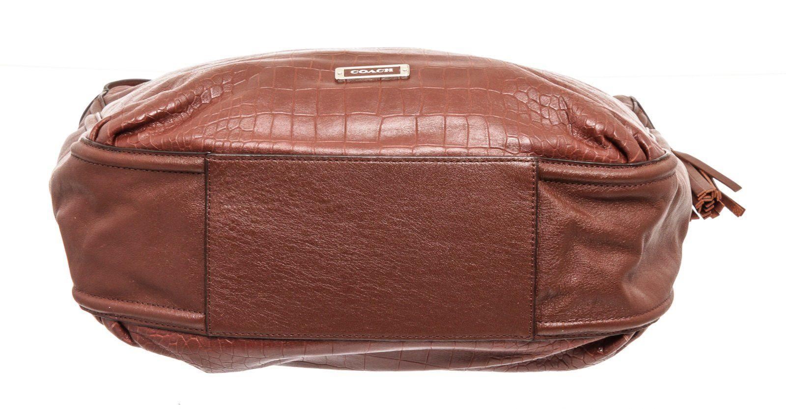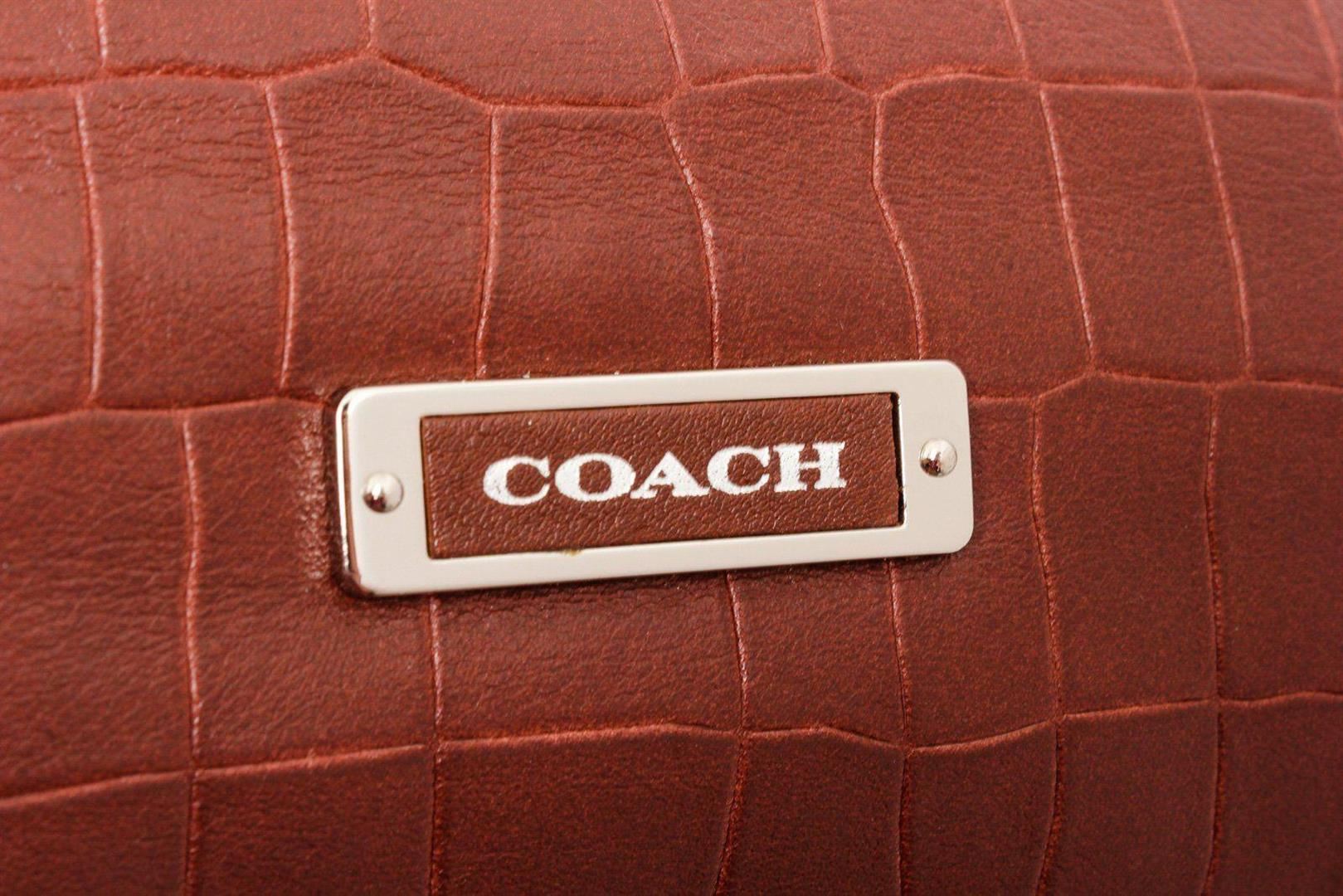 Coach Brown Leather Avery Embossed Satchel with gold-tone hardware, embossed logo, exterior zip pockets, interior zip pockets, top handle, leather shoulder strap, and zipper closure. Measurements: Length: 14.1 in / 36 cm Width: 4 in / 10 cm 9.7 in / 25 cm Condition: Pre-Owned Good overall, please see photographs for detail.