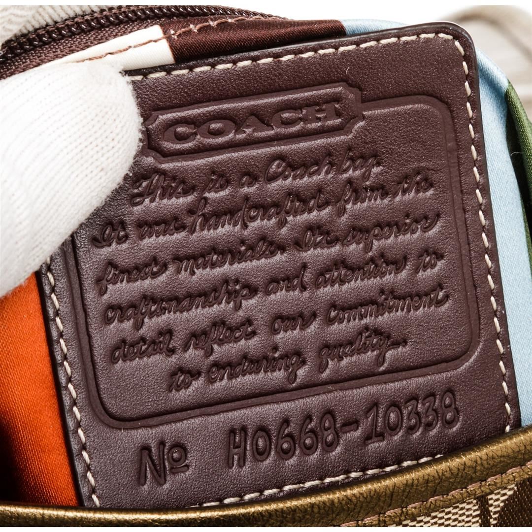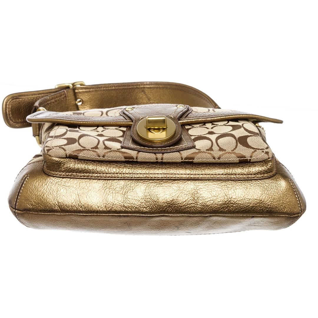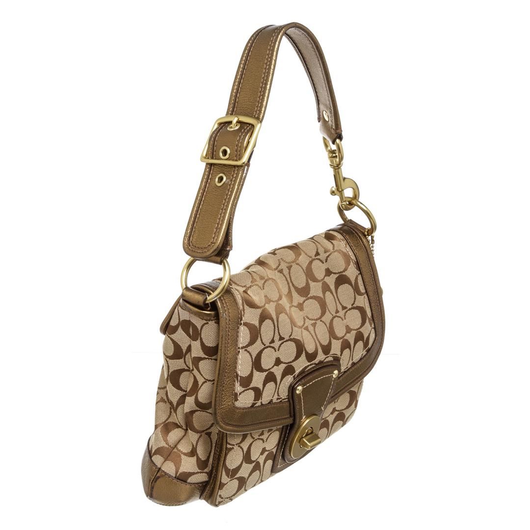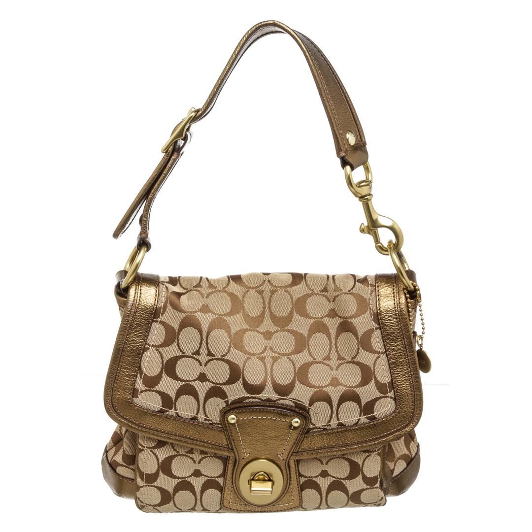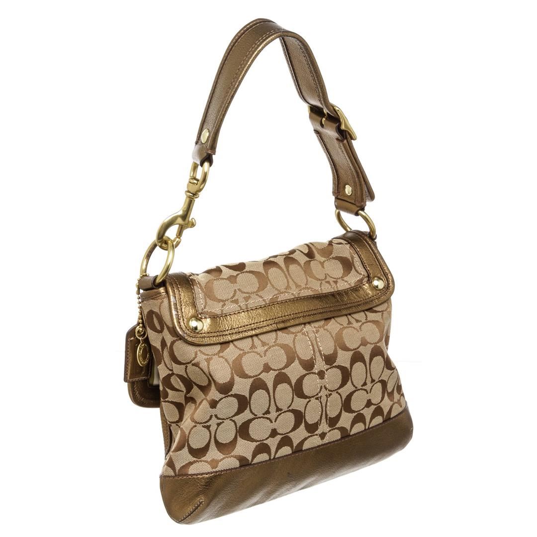 Coach brown monogram canvas shoulder bag with gold leather trim, gold-tone hardware, stripe satin lining, dual interior slip pockets, interior zipper pocket, exterior front pocket under flap closure with turn-lock closure. Authentic.