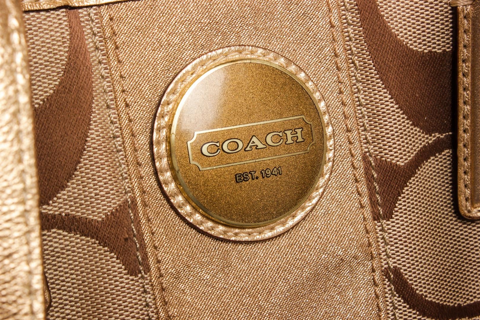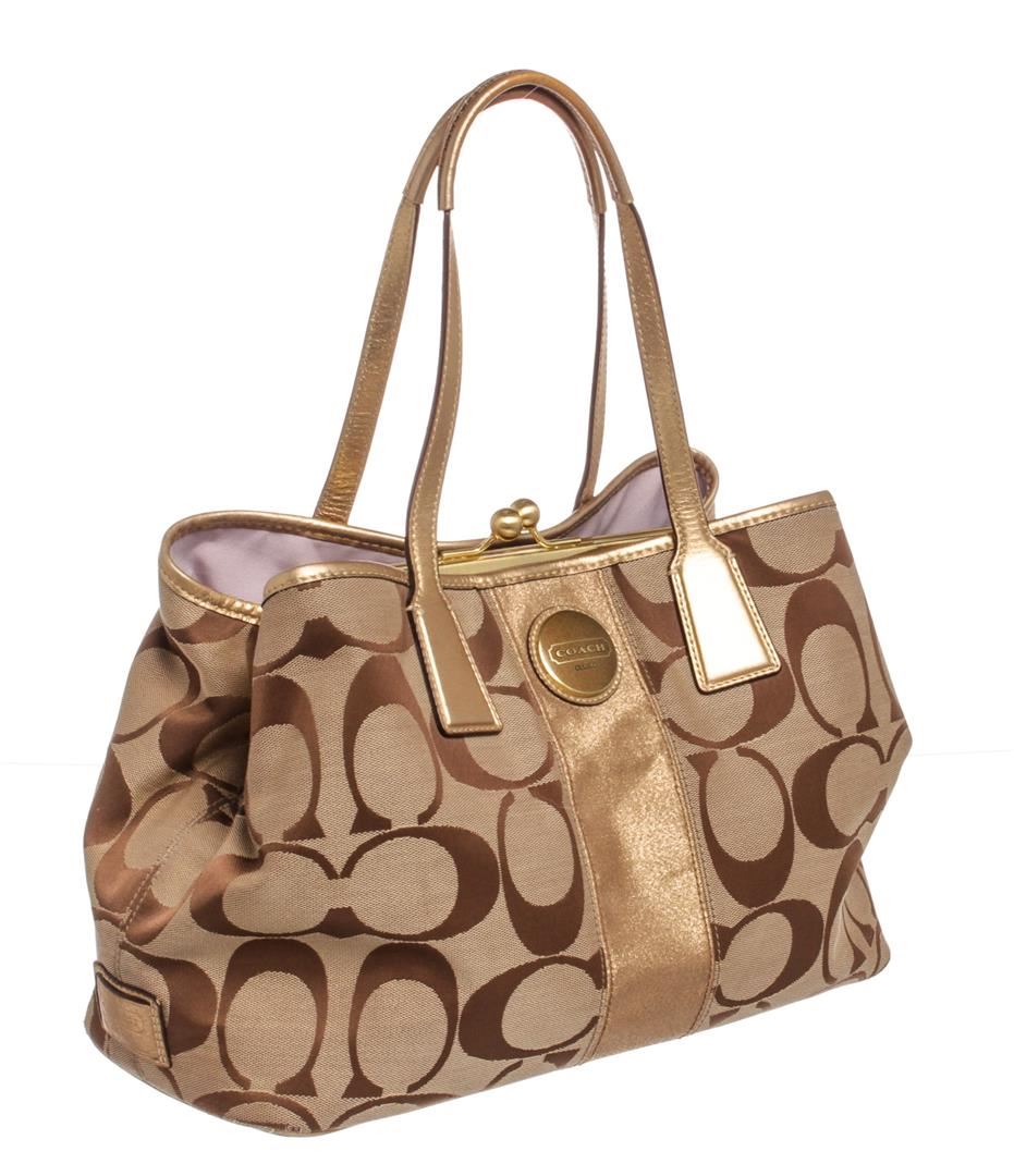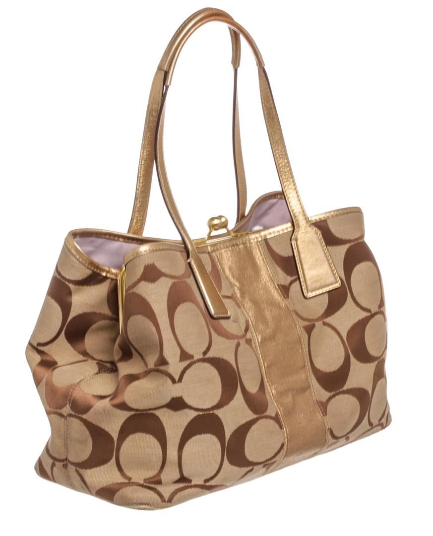Overall kiss lock top closure. Interior is lilac satin lined with a dual slip pockets and one side zip pocket. Exterior gold metallic leather trim and leather shoulder flat straps.
