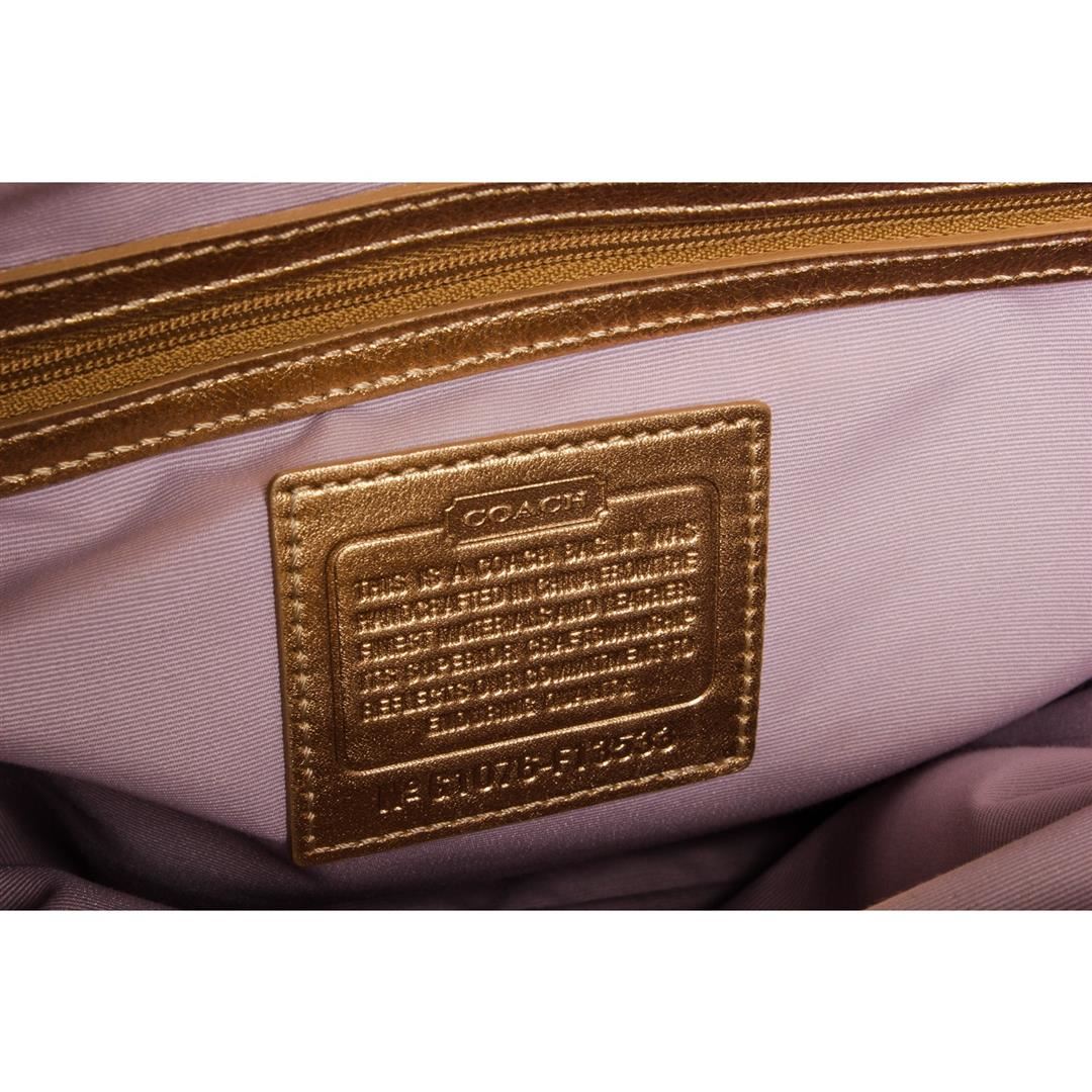 Overall kiss lock top closure. Interior is lilac satin lined with a dual slip pockets and one side zip pocket. Exterior gold metallic leather trim and leather shoulder flat straps.