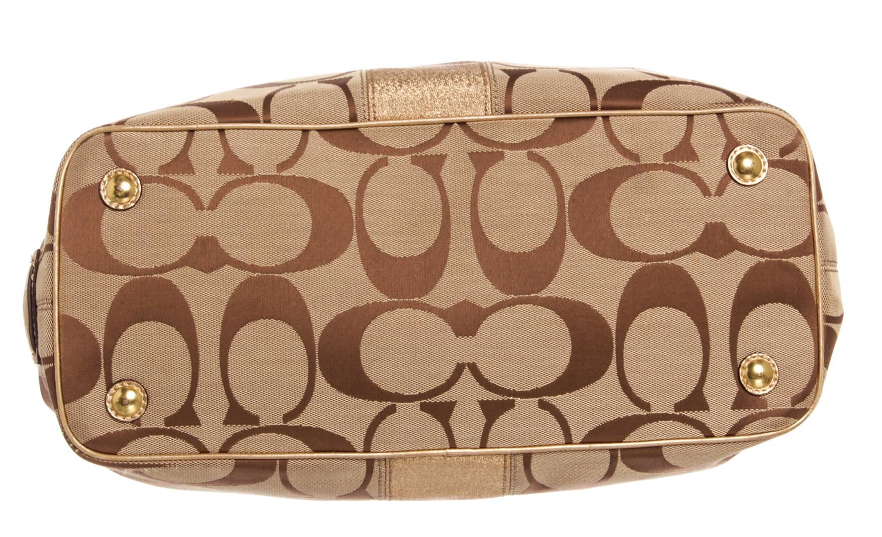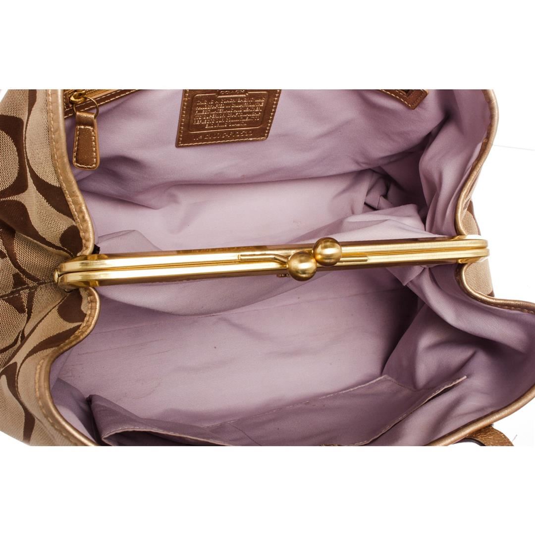 Overall kiss lock top closure. Interior is lilac satin lined with a dual slip pockets and one side zip pocket. Exterior gold metallic leather trim and leather shoulder flat straps.