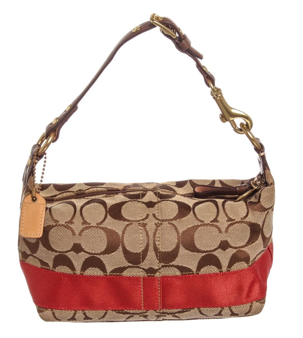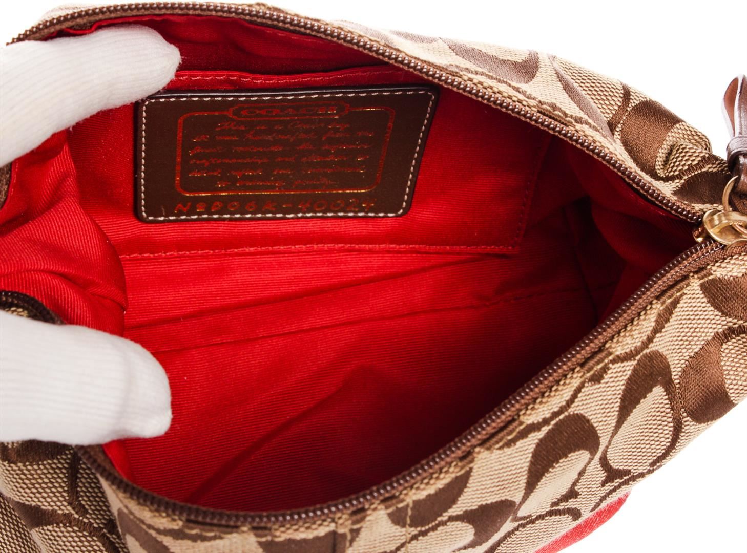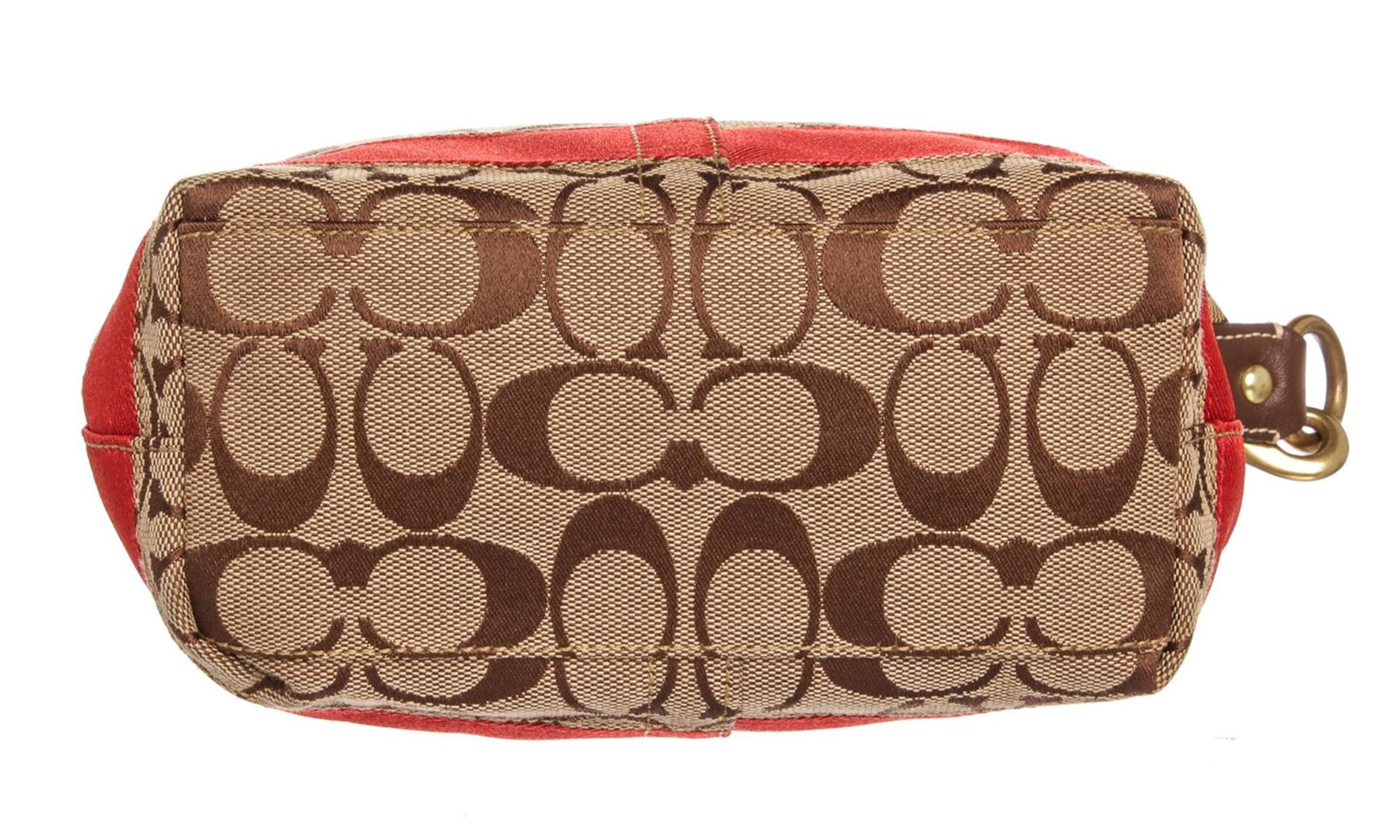 Overall zip-top closure. Interior is orange fabric lined with one side zip pocket. Exterior brown leather trim and single flat strap.