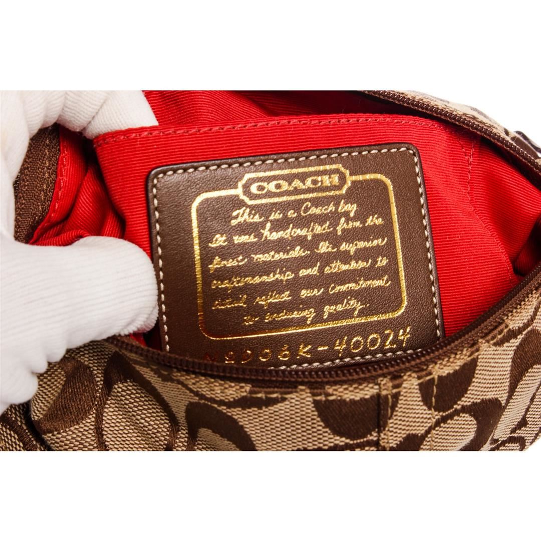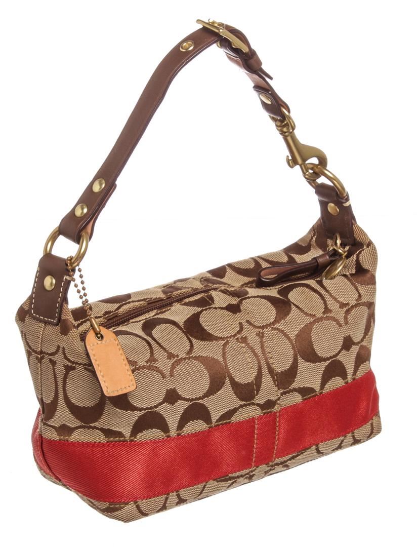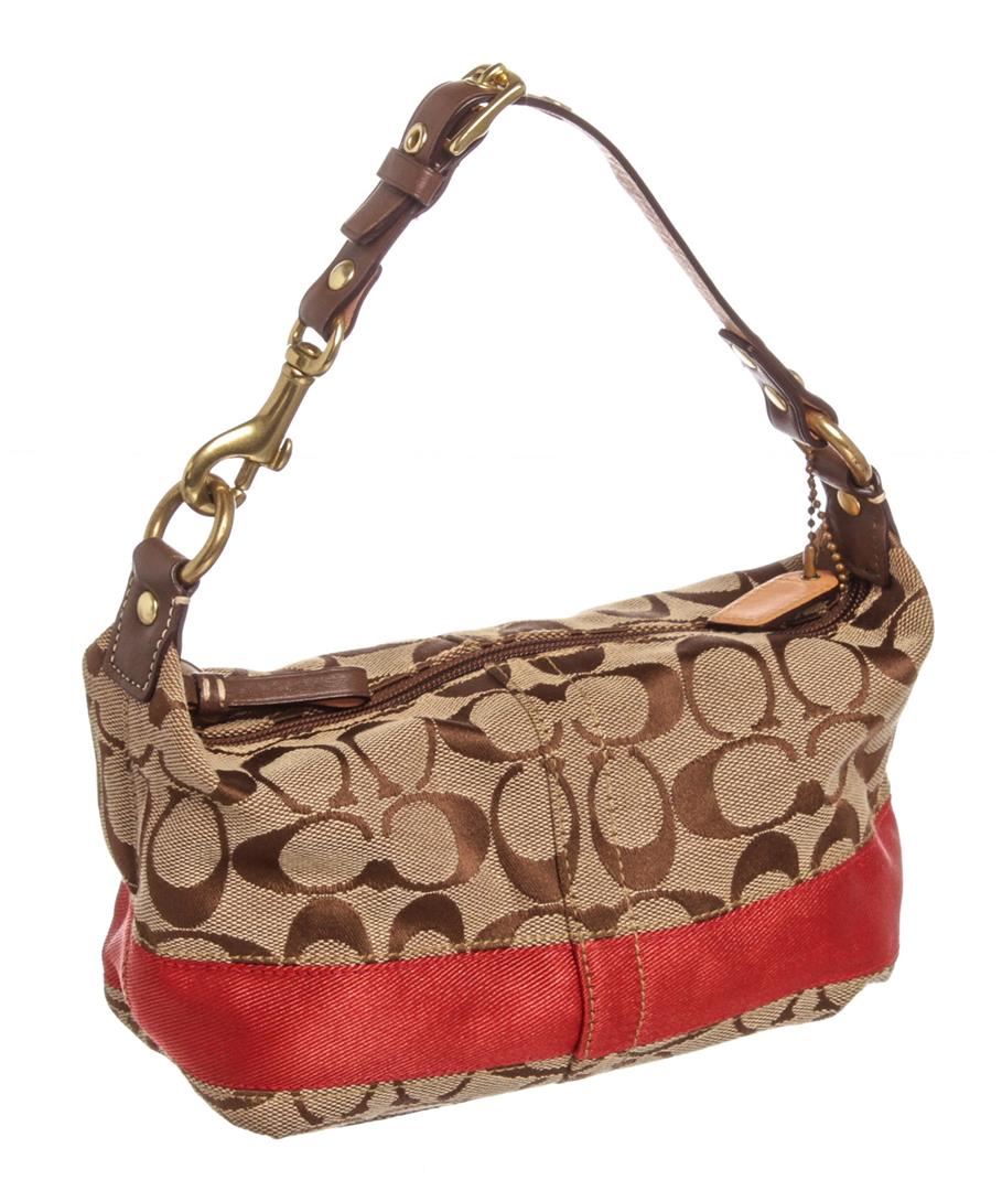 Overall zip-top closure. Interior is orange fabric lined with one side zip pocket. Exterior brown leather trim and single flat strap.