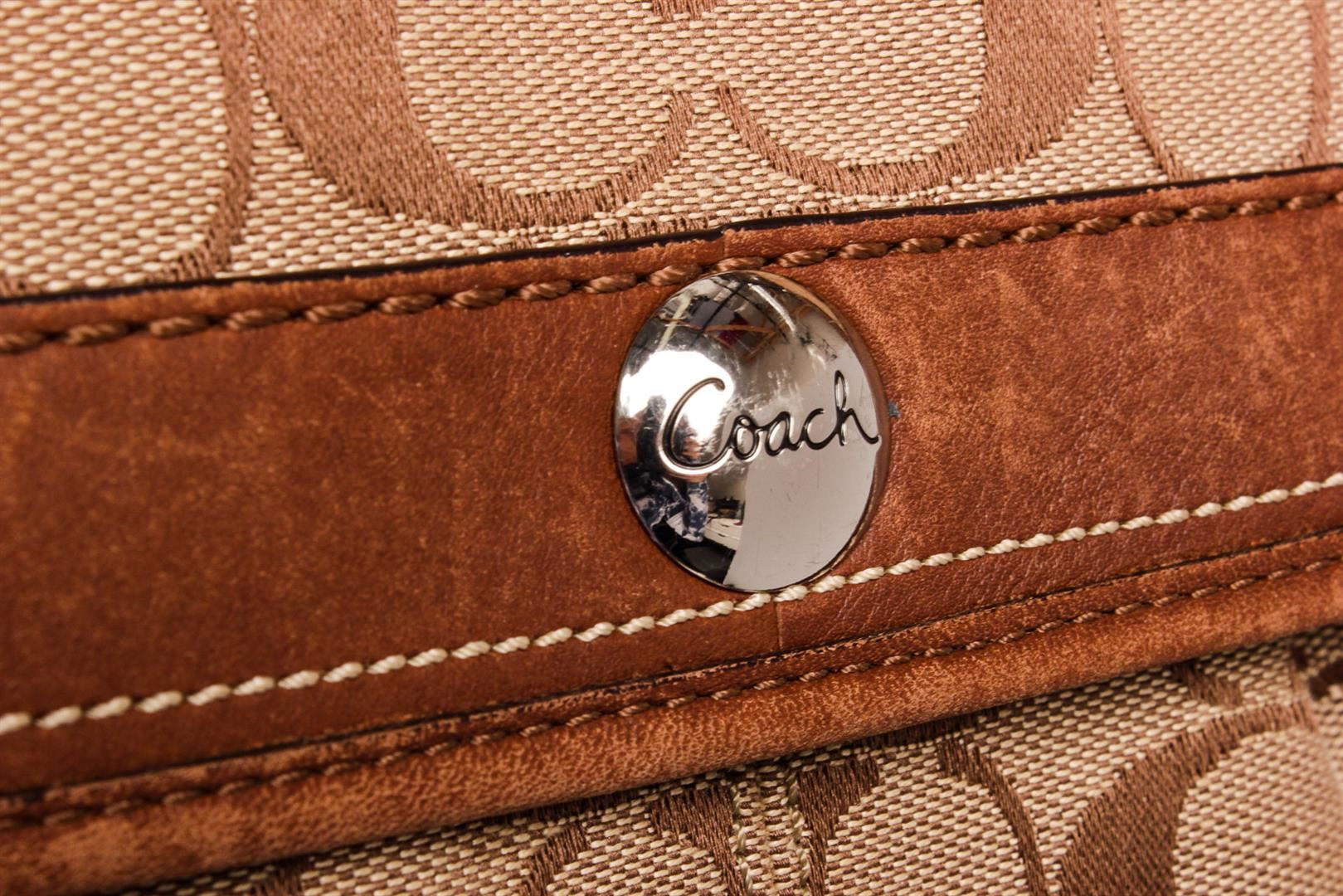 Crafted out of brown monogram canvas, brown leather trim, and silver tone hardware. Inner brown canvas lining, dual slip pockets, and one side zip pocket.