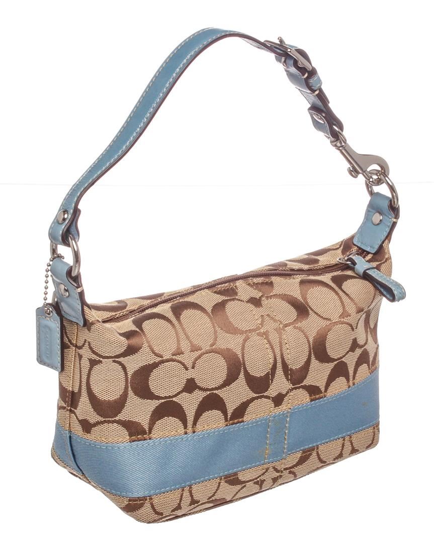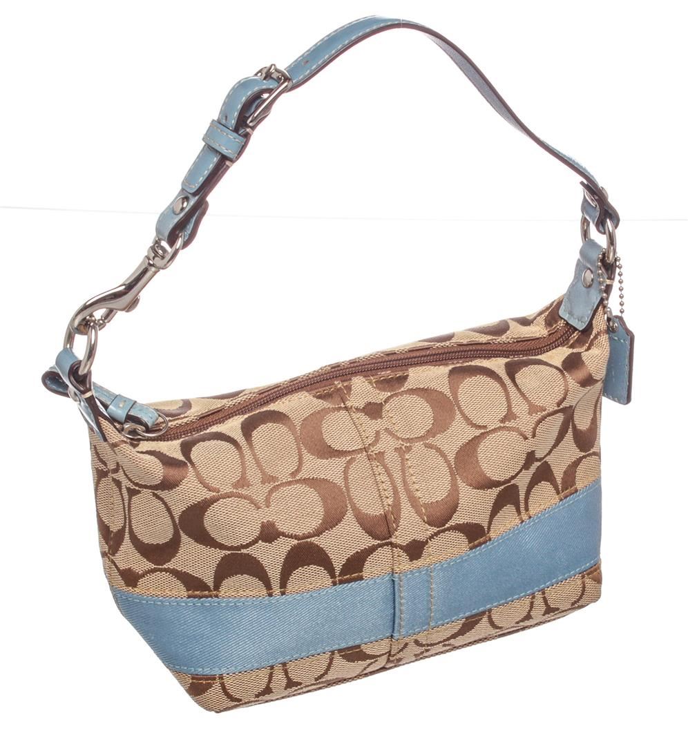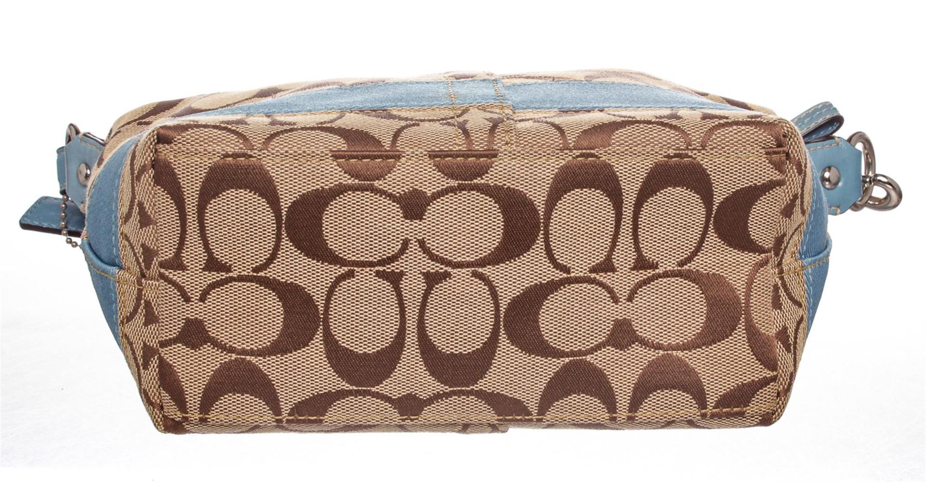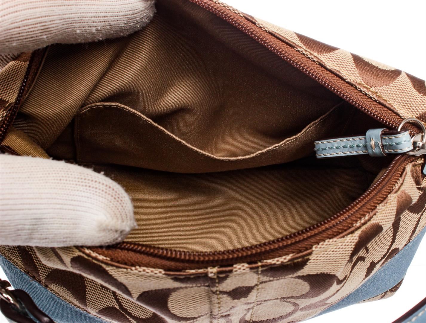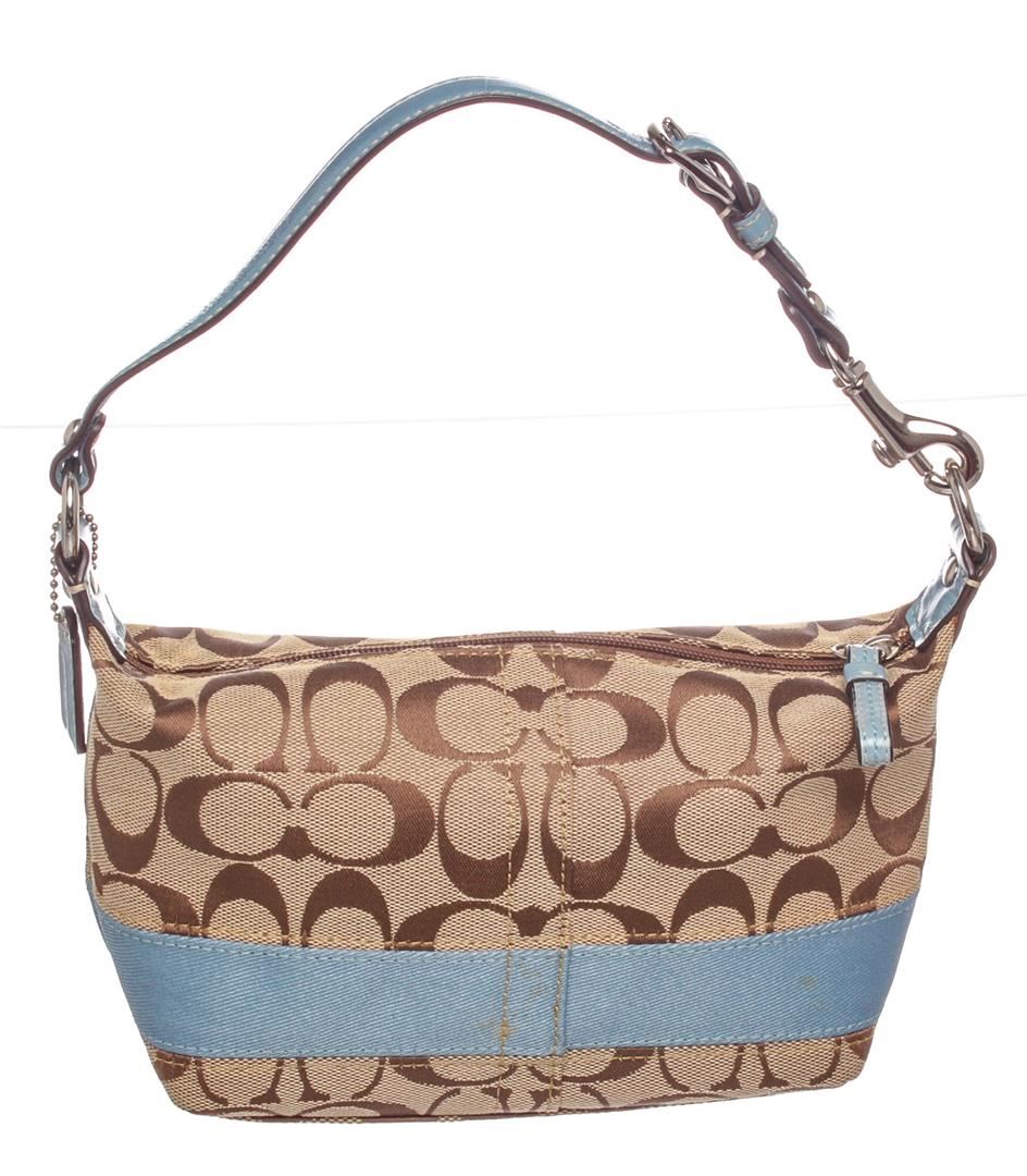 Overall zip-top closure. Interior is brown fabric lined with one side zip pocket. Exterior light blue patent leather trim and single flat strap.