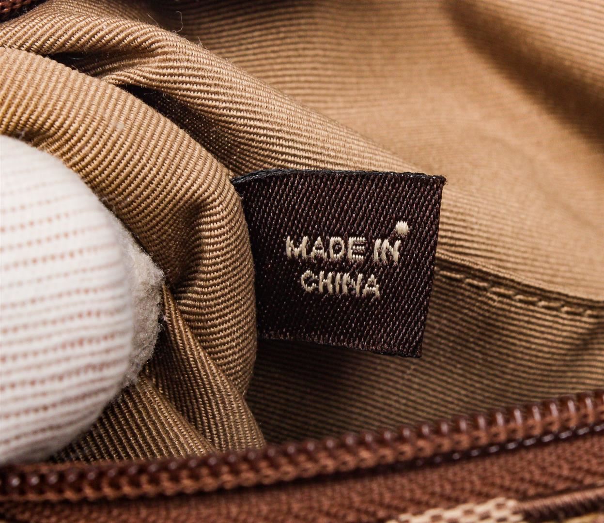 One Coach Brown Monogram Canvas Patent Leather Trim Mini Baguette Handbag. Overall zip-top closure. Interior is brown fabric lined with one side zip pocket. Exterior light blue patent leather trim and single flat strap.
