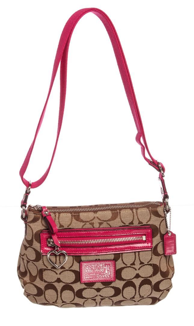 Overall zipper top closure. Interior is brown satin fabric lined with dual single slip pocket. Single pink flat canvas handle.