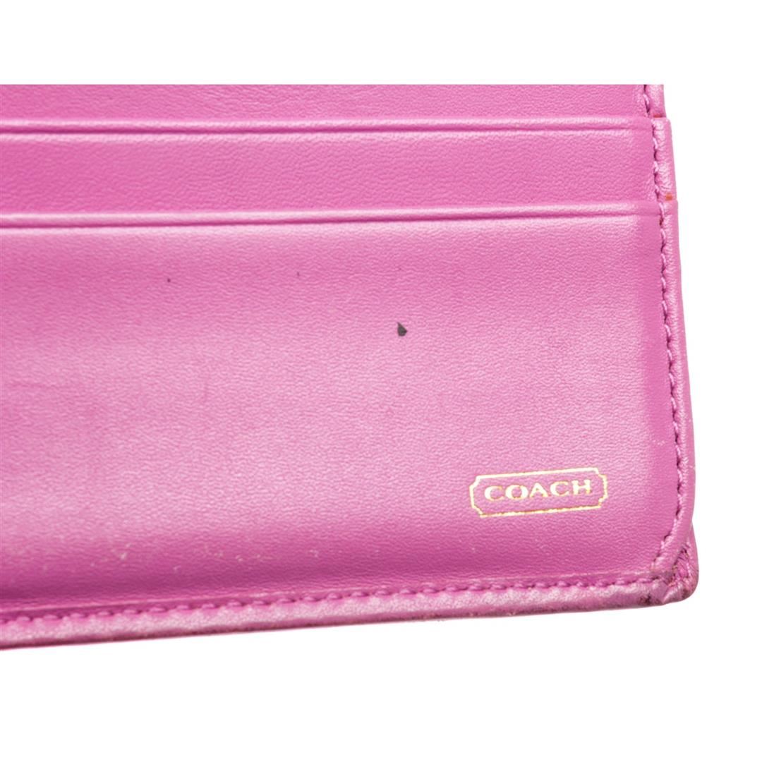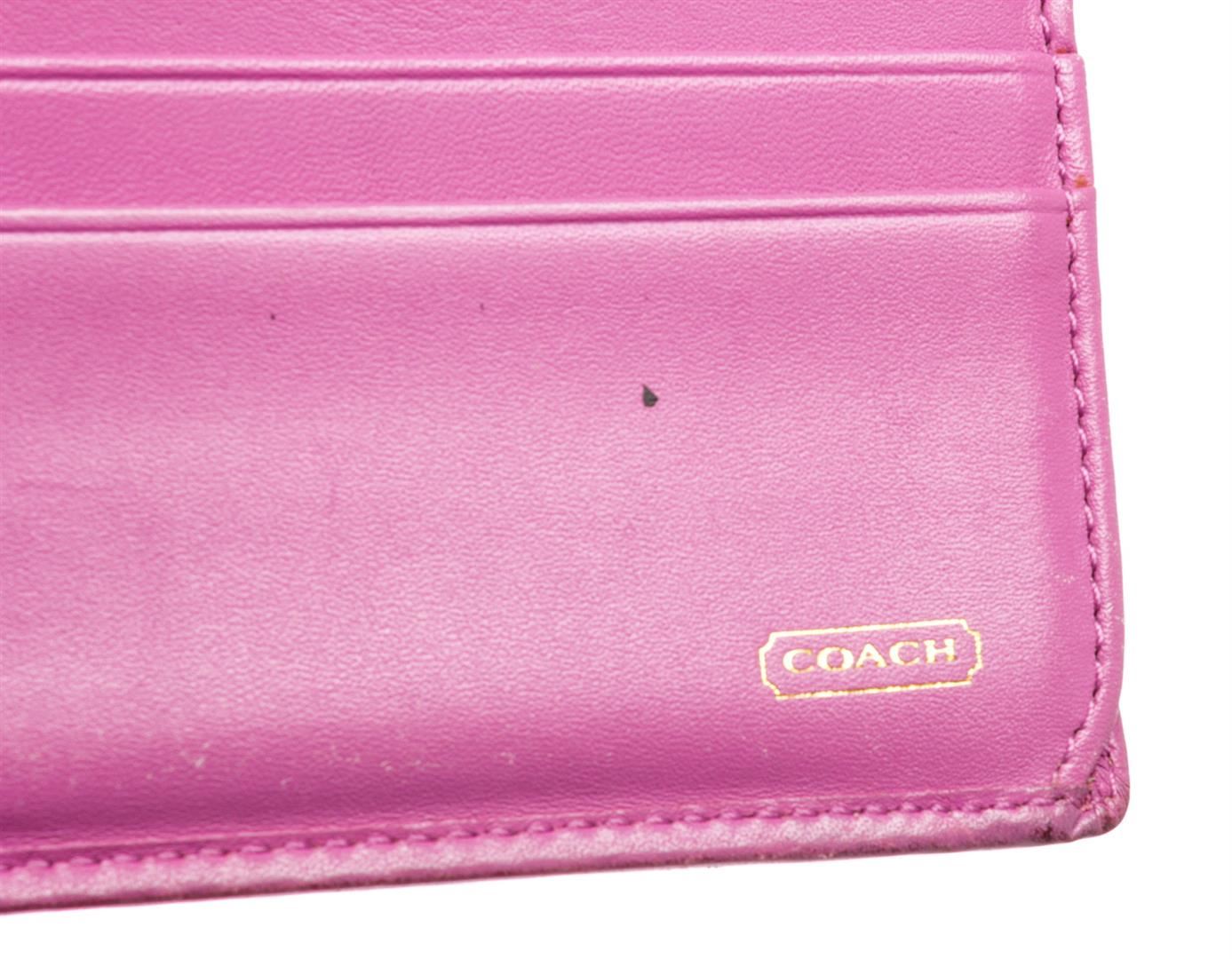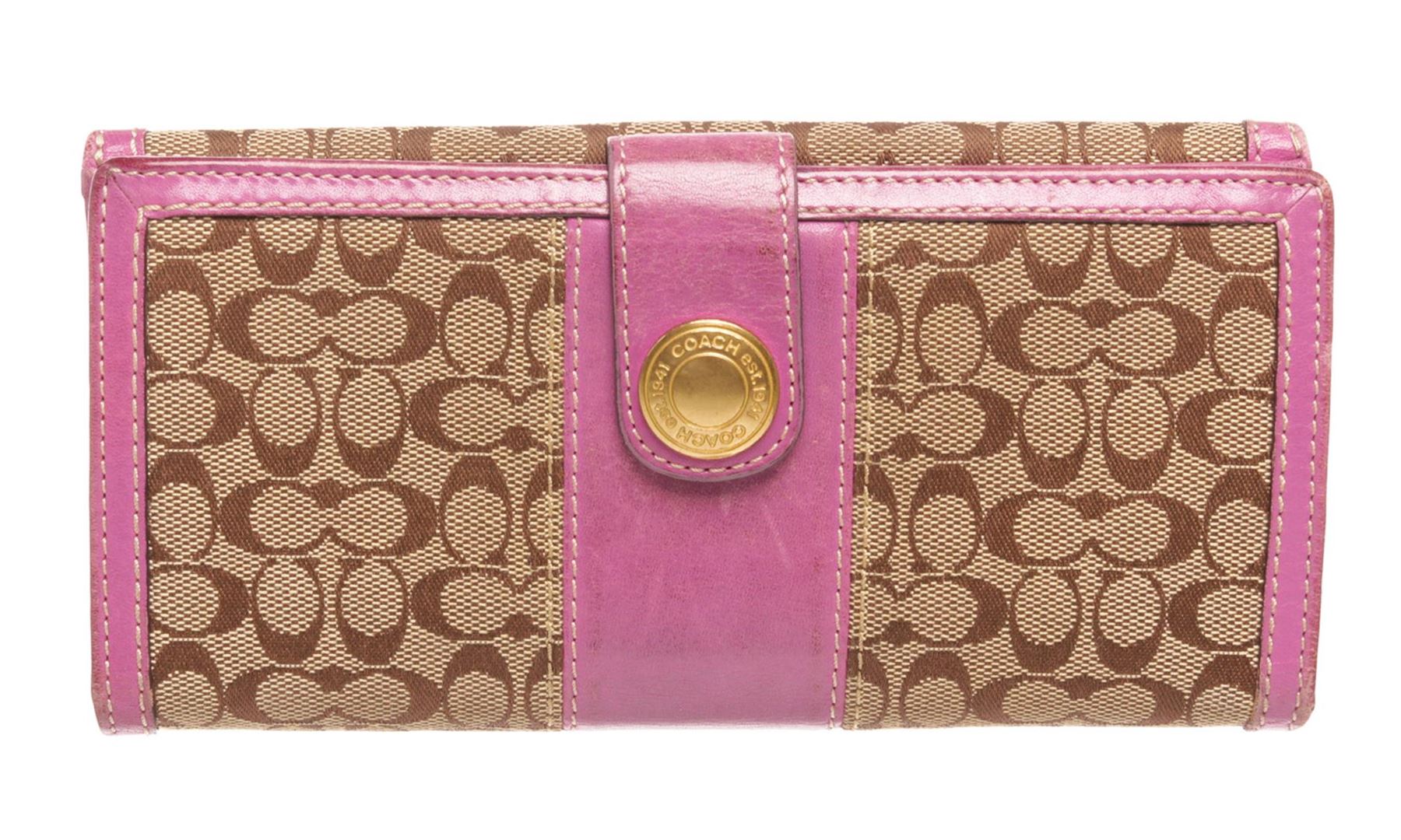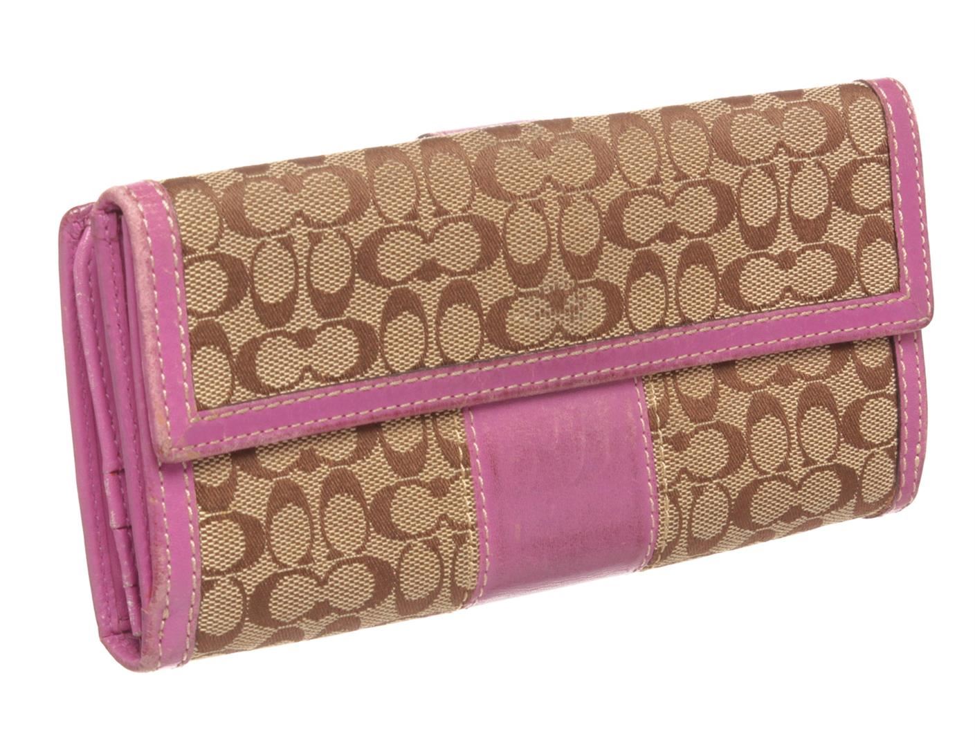 Coach brown monogram canvas long wallet with purple leather trim and lining, gold-tone hardware, flap pocket pouch on one side, other side opens bifold to twelve card slots, three bill pockets, and snap closure.